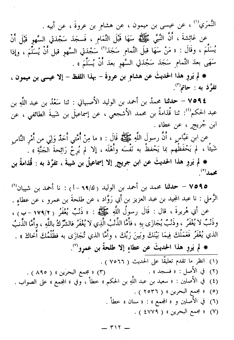 7595 - حَدَّثَنَا مُحَمَّدُ بْنُ أَحْمَدَ بْنِ الْوَلِيدِ، نَا أَحْمَدُ بْنُ شَيْبَانَ الرَّمْلِيُّ، نَا عَبْدُ الْمَجِيدِ بْنُ عَبْدِ الْعَزِيزِ بْنِ أَبِي رَوَّادٍ، عَنْ طَلْحَةَ بْنِ عَمْرٍو، عَنْ عَطَاءٍ، عَنْ أَبِي هُرَيْرَةَ قَالَ: قَالَ رَسُولُ اللَّهِ صَلَّى اللهُ عَلَيْهِ وَسَلَّمَ: «§ذَنْبٌ يُغْفَرُ، وَذَنْبٌ لَا يُغْفَرُ، وَذَنْبٌ يُجَازَى بِهِ، فَأَمَّا الذَّنْبُ الَّذِي لَا يُغْفَرُ فَالشِّرْكُ بِاللَّهِ، وَأَمَّا الذَّنْبُ الَّذِي يُغْفَرُ فَعَمَلُكَ فِيمَا بَيْنَكَ وَبَيْنَ رَبِّكَ، وَأَمَّا الَّذِي تُجَازَى بِهِ فَظُلْمُكَ أَخَاكَ»