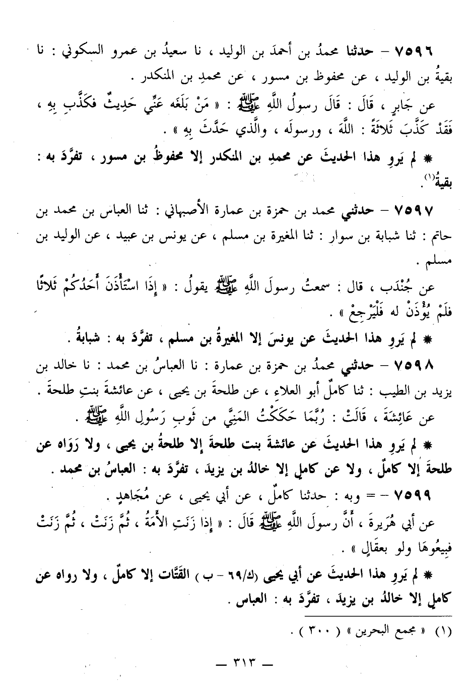 7596 - حَدَّثَنَا مُحَمَّدُ بْنُ أَحْمَدَ بْنِ الْوَلِيدِ، نَا سَعِيدُ بْنُ عَمْرٍو السَّكُونِيُّ، نَا بَقِيَّةُ بْنُ الْوَلِيدِ، عَنْ مَحْفُوظِ بْنِ مِسْوَرٍ، عَنْ مُحَمَّدِ بْنِ الْمُنْكَدِرِ، عَنْ جَابِرٍ قَالَ: قَالَ رَسُولُ اللَّهِ صَلَّى اللهُ عَلَيْهِ وَسَلَّمَ: «§مَنْ بَلَغَهُ عَنِّي حَدِيثٌ فَكَذَّبَ بِهِ، فَقَدْ كَذَّبَ ثَلَاثَةً: اللَّهَ، وَرَسُولَهُ، وَالَّذِي حَدَّثَ بِهِ»