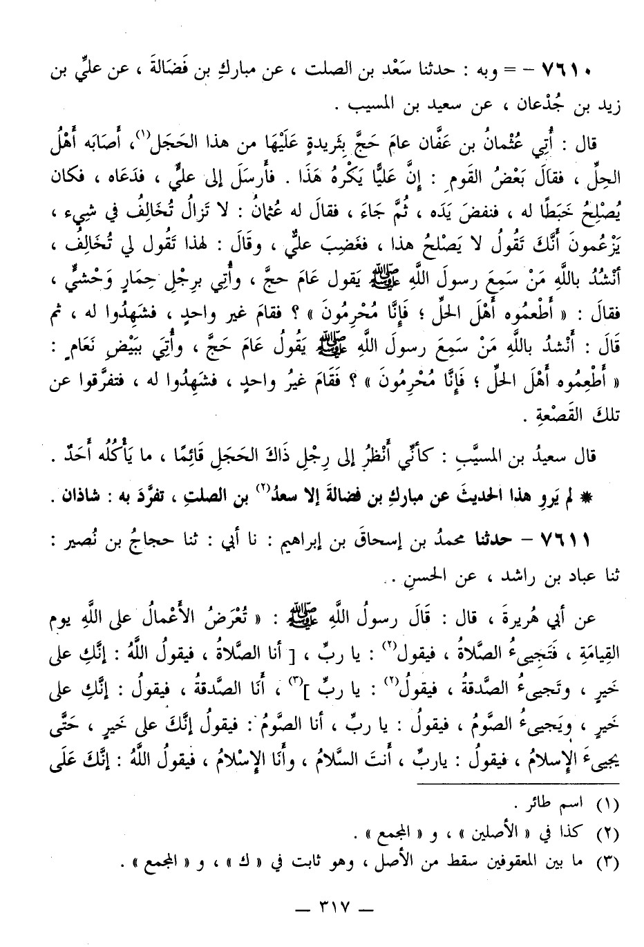 7610 - وَبِهِ: حَدَّثَنَا سَعْدُ بْنُ الصَّلْتِ، عَنْ مُبَارَكِ بْنِ فَضَالَةَ، عَنْ عَلِيِّ بْنِ زَيْدِ بْنِ جُدْعَانَ، عَنْ سَعِيدِ بْنِ الْمُسَيِّبِ قَالَ: أُتِيَ عُثْمَانُ بْنُ عَفَّانَ عَامَ حَجَّ بِثَرِيدَةٍ عَلَيْهَا مِنْ هَذَا الْحَجَلِ، أَصَابَهُ أَهْلُ الْحِلِّ، فَقَالَ بَعْضُ الْقَوْمِ: إِنَّ عَلِيًّا يَكْرَهُ هَذَا. فَأَرْسَلَ إِلَى عَلِيٍّ، فَدَعَاهُ، فَكَانَ يُصْلِحُ خَبَطًا لَهُ، فَنَفَضَ يَدَهُ، ثُمَّ جَاءَ، فَقَالَ لَهُ عُثْمَانُ: لَا تَزَالُ تُخَالِفُ فِي شَيْءٍ، يَزْعُمُونَ أَنَّكَ تَقُولُ لَا يَصْلُحُ هَذَا، فَغَضِبَ عَلِيٌّ، وَقَالَ: لِهَذَا تَقُولُ لِي تُخَالِفُ، أَنْشُدُ بِاللَّهِ مَنْ سَمِعَ رَسُولَ اللَّهِ صَلَّى اللهُ عَلَيْهِ وَسَلَّمَ يَقُولُ عَامَ حَجَّ، وَأُتِيَ بِرِجْلِ حِمَارٍ وَحْشِيٍّ، فَقَالَ: «§أَطْعِمُوهُ أَهْلَ الْحِلِّ، فَإِنَّا مُحْرِمُونَ» ؟ فَقَامَ غَيْرُ وَاحِدٍ، فَشَهِدُوا لَهُ، ثُمَّ قَالَ: أَنْشُدُ بِاللَّهِ مَنْ سَمِعَ رَسُولَ اللَّهِ صَلَّى اللهُ عَلَيْهِ وَسَلَّمَ يَقُولُ عَامَ حَجَّ، وَأُتِيَ بِبَيْضِ نَعَامٍ: «أَطْعِمُوهُ أَهْلَ الْحِلِّ، فَإِنَّا مُحْرِمُونَ» ؟ فَقَامَ غَيْرُ وَاحِدٍ، فَشَهِدُوا لَهُ، فَتَفَرَّقُوا عَنْ تِلْكَ الْقَصْعَةِ قَالَ سَعِيدُ بْنُ الْمُسَيِّبِ: «كَأَنِّي أَنْظُرُ إِلَى رِجْلِ ذَاكَ الْحَجَلِ قَائِمًا، مَا يَأْكُلُهُ أَحَدٌ»