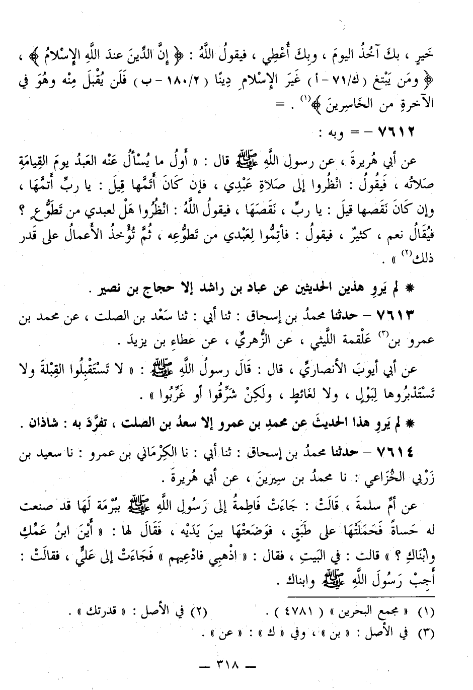 7612 - وَبِهِ: عَنْ أَبِي هُرَيْرَةَ، عَنْ رَسُولِ اللَّهِ صَلَّى اللهُ عَلَيْهِ وَسَلَّمَ قَالَ: «أَوَّلُ مَا يُسْأَلُ عَنْهُ الْعَبْدُ يَوْمَ الْقِيَامَةِ صَلَاتُهُ، فَيَقُولُ: §انْظُرُوا إِلَى صَلَاةِ عَبْدِي، فَإِنْ كَانَ أَتَمَّهَا قِيلَ: يَا رَبِّ أَتَمَّهَا، وَإِنْ كَانَ نَقَصَهَا قِيلَ: يَا رَبِّ، نَقَصَهَا، فَيَقُولُ اللَّهُ: انْظُرُوا هَلْ لِعَبْدِي مِنْ تَطَوُّعٍ؟ فَيُقَالُ نَعَمْ، كَثِيرٌ، فَيَقُولُ: فَأَتِمُّوا لِعَبْدِي مِنْ تَطَوُّعِهِ، ثُمَّ تُؤْخَذُ الْأَعْمَالُ عَلَى قَدْرِ ذَلِكَ»