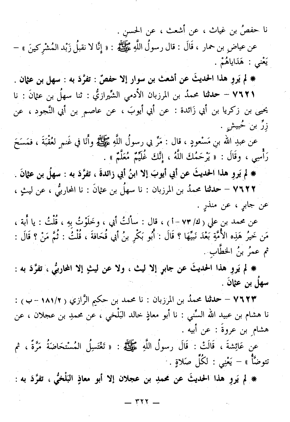 7621 - حَدَّثَنَا مُحَمَّدُ بْنُ الْمَرْزُبَانِ الْأَدَمِيُّ الشِّيرَازِيُّ، ثَنَا سَهْلُ بْنُ عُثْمَانَ، نَا يَحْيَى بْنُ زَكَرِيَّا بْنِ أَبِي زَائِدَةَ، عَنْ أَبِي أَيُّوبَ، عَنْ عَاصِمِ بْنِ أَبِي النَّجُودِ، عَنْ زِرِّ بْنِ حُبَيْشٍ، عَنْ عَبْدِ اللَّهِ بْنِ مَسْعُودٍ قَالَ: مَرَّ بِي رَسُولُ اللَّهِ صَلَّى اللهُ عَلَيْهِ وَسَلَّمَ وَأَنَا فِي غَنَمٍ لِعُقْبَةَ، فَمَسَحَ رَأْسِي، وَقَالَ: «§يَرْحَمُكَ اللَّهُ، إِنَّكَ غُلَيِّمٌ مُعَلَّمٌ»