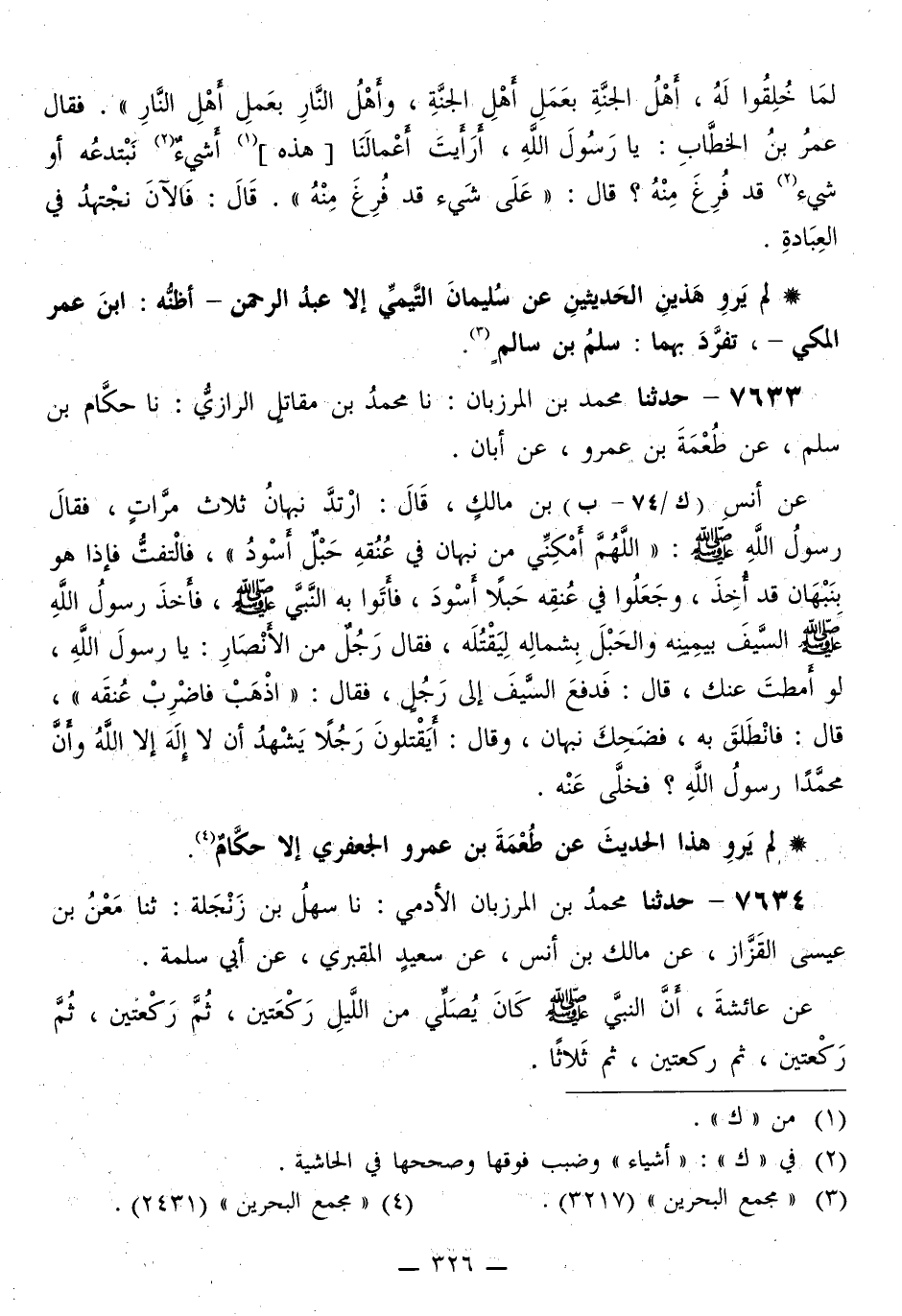 7633 - حَدَّثَنَا مُحَمَّدُ بْنُ الْمَرْزُبَانِ، نَا مُحَمَّدُ بْنُ مُقَاتِلٍ الرَّازِيُّ، نَا حَكَّامُ بْنُ سَلْمٍ، عَنْ طُعْمَةَ بْنِ عَمْرٍو، عَنْ أَبَانَ، عَنْ أَنَسِ بْنِ مَالِكٍ قَالَ: ارْتَدَّ نَبْهَانُ ثَلَاثَ مَرَّاتٍ، فَقَالَ رَسُولُ اللَّهِ صَلَّى اللهُ عَلَيْهِ وَسَلَّمَ: «§اللَّهُمَّ أَمْكِنِّي مِنْ نَبْهَانَ فِي عُنُقِهِ حَبْلٌ أَسْوَدُ» ، فَالْتَفَتَ فَإِذَا هُوَ بِنَبْهَانَ قَدْ أُخِذَ، وَجَعَلُوا فِي عُنُقِهِ حَبْلًا أَسْوَدَ، فَأَتَوْا بِهِ النَّبِيَّ صَلَّى اللهُ عَلَيْهِ وَسَلَّمَ، فَأَخَذَ رَسُولُ اللَّهِ صَلَّى اللهُ عَلَيْهِ وَسَلَّمَ السَّيْفَ بِيَمِينِهِ، وَالْحَبْلَ بِشِمَالِهِ لِيَقْتُلَهُ، فَقَالَ رَجُلٌ مِنَ الْأَنْصَارِ: يَا رَسُولَ اللَّهِ، لَوْ أَمَطْتَ عَنْكَ قَالَ: فَدَفَعَ السَّيْفَ إِلَى رَجُلٍ، فَقَالَ: «اذْهَبْ فَاضْرِبْ عُنُقَهَ» قَالَ: فَانْطَلَقَ بِهِ، فَضَحِكَ نَبْهَانُ، وَقَالَ: أَيَقْتُلُونَ رَجُلًا يَشْهَدُ أَنْ لَا إِلَهَ إِلَّا اللَّهُ وَأَنَّ مُحَمَّدًا رَسُولُ اللَّهِ؟ فَخَلَّى عَنْهُ «