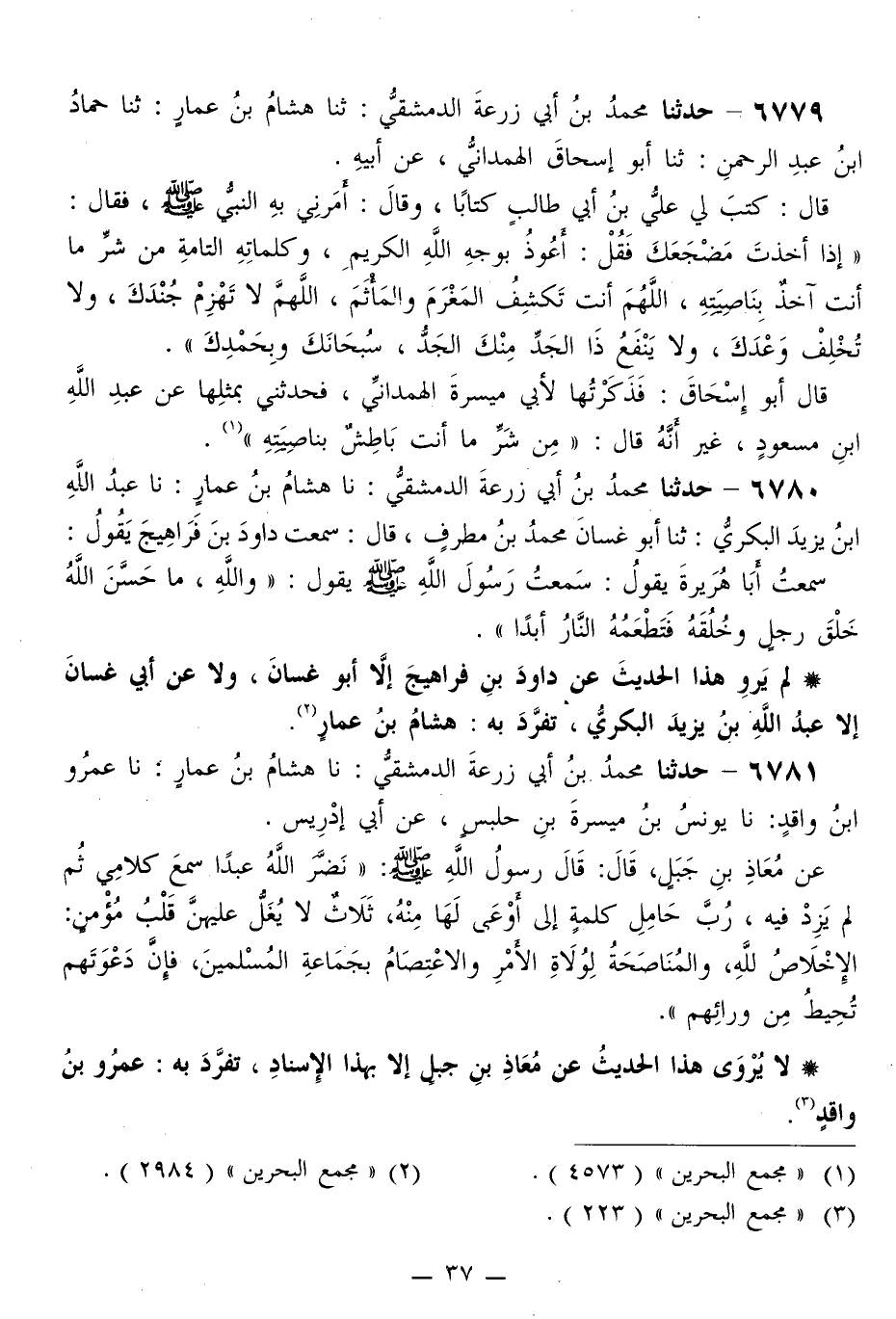 6779 - حَدَّثَنَا مُحَمَّدُ بْنُ أَبِي زُرْعَةَ الدِّمَشْقِيُّ، ثَنَا هِشَامُ بْنُ عَمَّارٍ، ثَنَا حَمَّادُ بْنُ عَبْدِ الرَّحْمَنِ، ثَنَا أَبُو إِسْحَاقَ الْهَمْدَانِيُّ، عَنْ أَبِيهِ قَالَ: كَتَبَ لِي عَلِيُّ بْنُ أَبِي طَالِبٍ، كِتَابًا، وَقَالَ: أَمَرَنِي بِهِ النَّبِيُّ صَلَّى اللهُ عَلَيْهِ وَسَلَّمَ، فَقَالَ: «§إِذَا أَخَذْتَ مَضْجَعَكَ فَقُلْ: أَعُوذُ بِوَجْهِ اللَّهِ الْكَرِيمِ، وَكَلِمَاتِهِ التَّامَّةِ مِنْ شَرِّ مَا أَنْتَ آخُذٌ بِنَاصِيَتِهِ، اللَّهُمَّ أَنْتَ تَكْشِفُ الْمَغْرَمَ وَالْمَأْثَمَ، اللَّهُمَّ لَا تُهْزَمُ جُنْدُكَ، وَلَا تَخْلُفُ وَعَدَكَ، وَلَا يَنْفَعُ ذَا الْجَدِّ مِنْكَ الْجَدُّ، سُبْحَانَكَ وَبِحَمْدِكَ» قَالَ أَبُو إِسْحَاقَ: فَذَكَرْتُها لِأَبِي مَيْسَرَةَ الْهَمْدَانِيِّ، فَحَدَّثَنِي بِمِثْلِهَا عَنْ عَبْدِ اللَّهِ بْنِ مَسْعُودٍ، غَيْرَ أَنَّهُ قَالَ: «مِنْ شَرِّ مَا أَنْتَ بَاطِشٌ بِنَاصِيَتِهِ»
