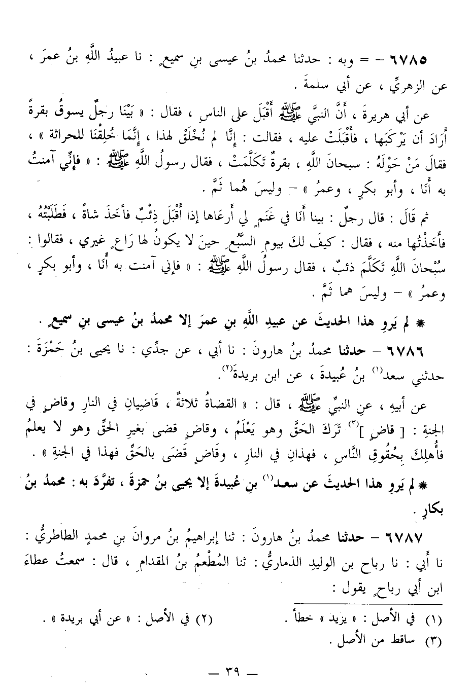 6785 - وَبِهِ: حَدَّثَنَا مُحَمَّدُ بْنُ عِيسَى بْنِ سُمَيْعٍ، نَا عُبَيْدُ اللَّهِ بْنُ عُمَرَ، عَنِ الزُّهْرِيِّ، عَنْ أَبِي سَلَمَةَ، عَنْ أَبِي هُرَيْرَةَ، أَنَّ النَّبِيَّ صَلَّى اللهُ عَلَيْهِ وَسَلَّمَ أَقْبَلَ عَلَى النَّاسِ، فَقَالَ: «§بَيْنَا رَجُلٌ يَسُوقُ بَقَرَةً أَرَادَ أَنْ يَرْكَبَهَا، فَأَقْبَلَتْ عَلَيْهِ، فَقَالَتْ: إِنَّا لَمْ نُخْلَقْ لِهَذَا، إِنَّمَا خُلِقْنَا لِلْحِرَاثَةِ» ، فَقَالَ مَنْ حَوْلَهُ: سُبْحَانَ اللَّهِ، بَقَرَةٌ تَكَلَّمَتْ، فَقَالَ رَسُولُ اللَّهِ صَلَّى اللهُ عَلَيْهِ وَسَلَّمَ: «فَإِنِّي آمَنْتُ بِهِ أَنَا، وَأَبُو بَكْرٍ، وَعُمَرُ» وَلَيْسَ هُمَا ثَمَّ