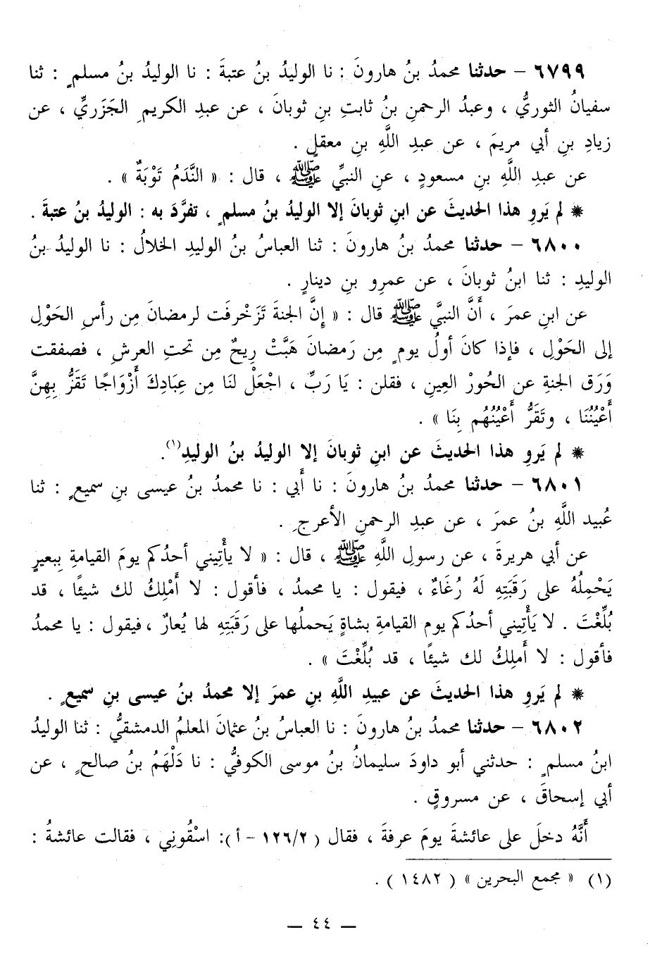 6799 - حَدَّثَنَا مُحَمَّدُ بْنُ هَارُونَ، نَا الْوَلِيدُ بْنُ عُتْبَةَ، نَا الْوَلِيدُ بْنُ مُسْلِمٍ، ثَنَا سُفْيَانُ الثَّوْرِيُّ، وَعَبْدُ الرَّحْمَنِ بْنُ ثَابِتِ بْنِ ثَوْبَانَ، عَنْ عَبْدِ الْكَرِيمِ الْجَزَرِيِّ، عَنْ زِيَادِ بْنِ أَبِي مَرْيَمَ، عَنْ عَبْدِ اللَّهِ بْنِ مَعْقِلٍ، عَنْ عَبْدِ اللَّهِ بْنِ مَسْعُودٍ، عَنِ النَّبِيِّ صَلَّى اللهُ عَلَيْهِ وَسَلَّمَ قَالَ: «§النَّدَمُ تَوْبَةٌ»