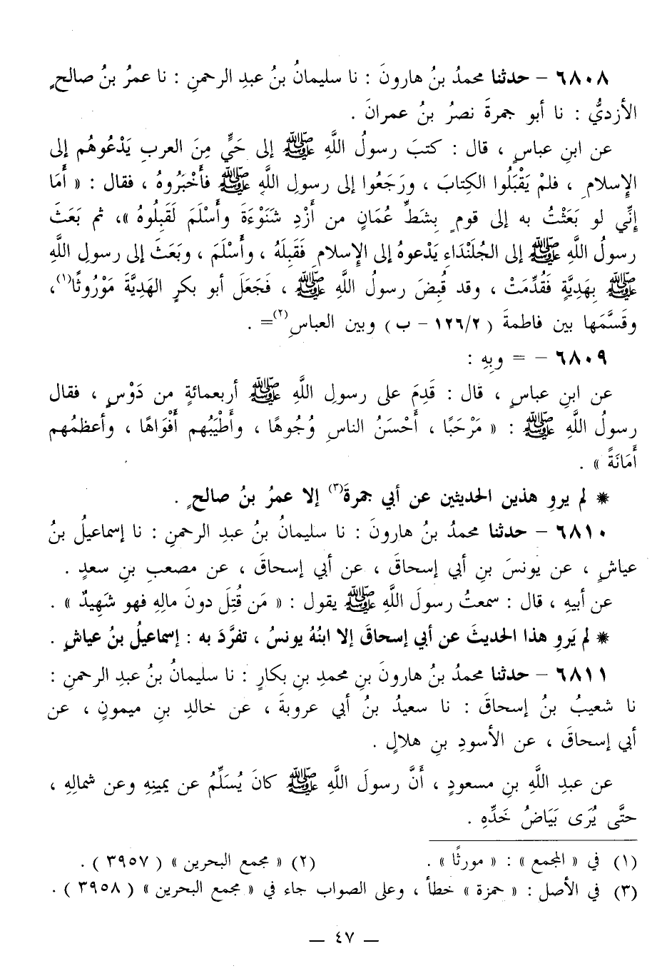 6808 - حَدَّثَنَا مُحَمَّدُ بْنُ هَارُونَ، نَا سُلَيْمَانُ بْنُ عَبْدِ الرَّحْمَنِ، نَا عُمَرُ بْنُ صَالِحٍ الْأَزْدِيُّ، نَا أَبُو جَمْرَةَ نَصْرُ بْنُ عِمْرَانَ، عَنِ ابْنِ عَبَّاسٍ قَالَ: كَتَبَ رَسُولُ اللَّهِ صَلَّى اللهُ عَلَيْهِ وَسَلَّمَ إِلَى حَيٍّ مِنَ الْعَرَبِ يَدْعُوهُمْ إِلَى الْإِسْلَامِ، فَلَمْ يَقْبَلُوا الْكِتَابَ، وَرَجَعُوا إِلَى رَسُولِ اللَّهِ صَلَّى اللهُ عَلَيْهِ وَسَلَّمَ فَأَخْبَرُوهُ، فَقَالَ: «أَمَّا §إِنِّي لَوْ بَعَثْتُ بِهِ إِلَى قَوْمٍ بِشَطِّ عُمَانَ مِنْ أَزْدِ شَنُوءَةَ وَأَسْلَمَ لَقَبِلُوهُ» ، ثُمَّ بَعَثَ رَسُولُ اللَّهِ صَلَّى اللهُ عَلَيْهِ وَسَلَّمَ إِلَى الْجُلَنْدَاءِ يَدْعُوهُ إِلَى الْإِسْلَامِ فَقَبِلَهُ، وَأَسْلَمَ، وَبَعَثَ إِلَى رَسُولِ اللَّهِ صَلَّى اللهُ عَلَيْهِ وَسَلَّمَ بِهَدِيَّةٍ، فَقَدِمَتْ وَقَدْ قُبِضَ رَسُولُ اللَّهِ صَلَّى اللهُ عَلَيْهِ وَسَلَّمَ، فَجَعَلَ أَبُو بَكْرٍ الْهَدِيَّةَ مَوْرُوثًا، وَقَسَمَهَا بَيْنَ فَاطِمَةَ وَبَيْنَ الْعَبَّاسِ