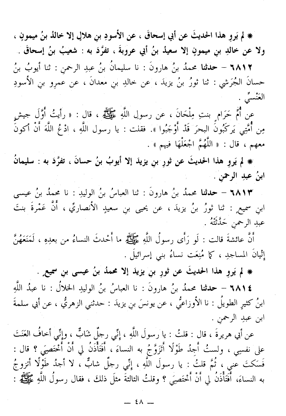6812 - حَدَّثَنَا مُحَمَّدُ بْنُ هَارُونَ، نَا سُلَيْمَانُ بْنُ عَبْدِ الرَّحْمَنِ، ثَنَا أَيُّوبُ بْنُ حَسَّانَ الْجُرَشِيُّ، ثَنَا ثَوْرُ بْنُ يَزِيدَ، عَنْ خَالِدِ بْنِ مَعْدَانَ، عَنْ عَمْرِو بْنِ الْأَسْوَدِ الْعَنْسِيِّ، عَنْ أُمِّ حَرَامٍ بِنْتِ مِلْحَانَ، عَنْ رَسُولِ اللَّهِ صَلَّى اللهُ عَلَيْهِ وَسَلَّمَ قَالَ: «§رَأَيْتُ أَوَّلَ جَيْشٍ مِنْ أُمَّتِي يَرْكَبُونَ الْبَحْرَ قَدْ أَوْجَبُوا» فَقُلْتُ: يَا رَسُولَ اللَّهِ، ادْعُ اللَّهِ أَنْ أَكُونَ مَعَهُمْ، فَقَالَ: «اللَّهُمَّ اجْعَلْهَا فِيهِمْ»