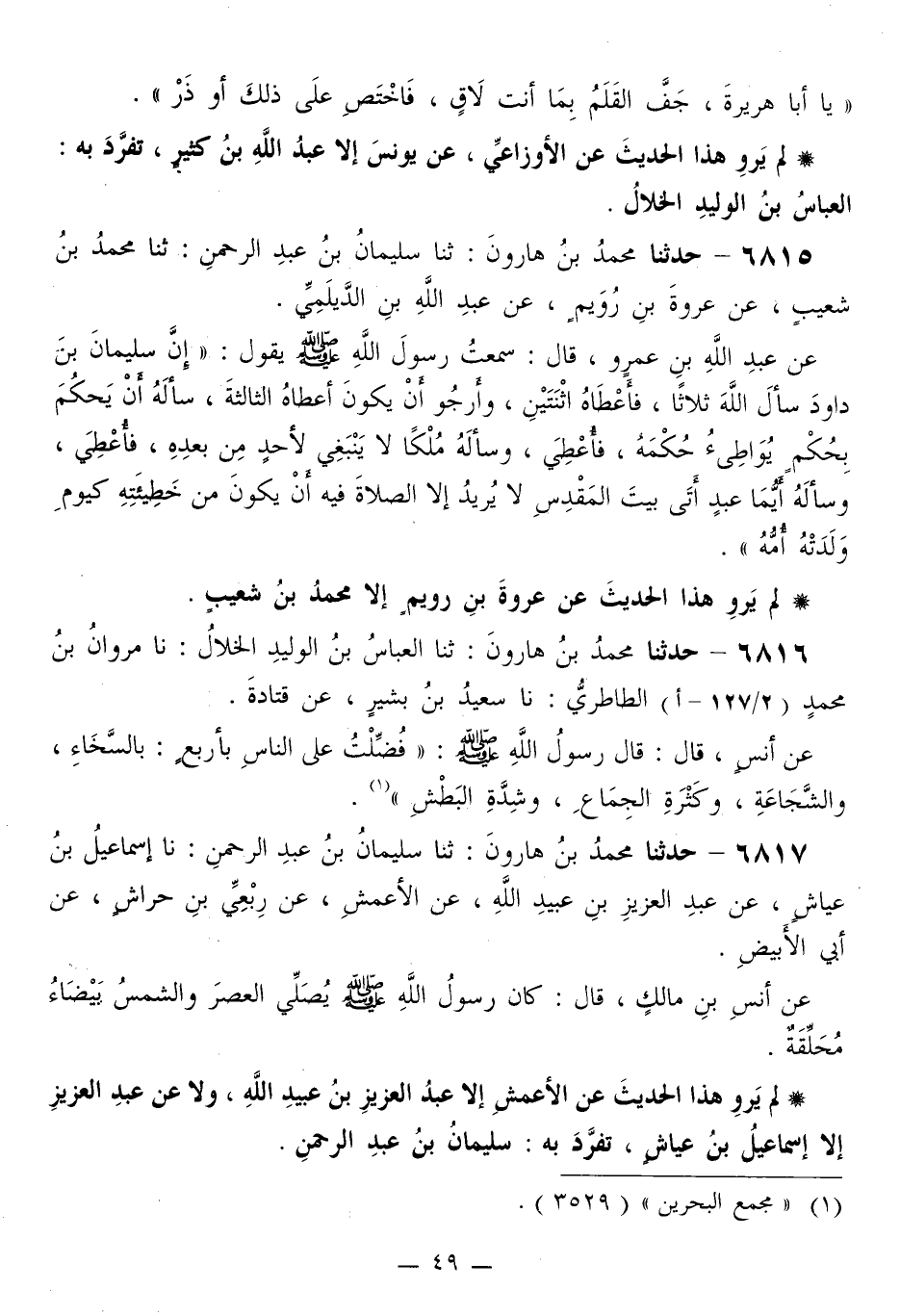 6815 - حَدَّثَنَا مُحَمَّدُ بْنُ هَارُونَ، ثَنَا سُلَيْمَانُ بْنُ عَبْدِ الرَّحْمَنِ، ثَنَا مُحَمَّدُ بْنُ شُعَيْبٍ، عَنْ عُرْوَةَ بْنِ رُوَيْمٍ، عَنْ عَبْدِ اللَّهِ بْنِ الدَّيْلَمِيِّ، عَنْ عَبْدِ اللَّهِ بْنِ عَمْرٍو قَالَ: سَمِعْتُ رَسُولَ اللَّهِ صَلَّى اللهُ عَلَيْهِ وَسَلَّمَ، يَقُولُ: «إِنَّ §سُلَيْمَانَ بْنَ دَاوُدَ سَأَلَ اللَّهَ ثَلَاثًا، فَأَعْطَاهُ اثْنَتَيْنِ، وَأَرْجُو أَنْ يَكُونَ أَعْطَاهُ الثَّالِثَةَ، سَأَلَهُ أَنْ يَحْكُمَ بِحُكْمٍ يُوَاطِئُ حُكْمَهُ، فَأُعْطِي، وَسَأَلَهُ مُلْكًا لَا يَنْبَغِي لِأَحَدٍ مِنْ بَعْدِهِ، فَأُعْطِي، وَسَأَلَهُ أَيُّمَا عَبْدٍ أَتَى بَيْتَ الْمَقْدِسِ لَا يُرِيدُ إِلَّا الصَّلَاةَ فِيهِ أَنْ يَكُونَ مِنْ خَطِيئَتِهِ كَيَوْمِ وَلَدَتْهُ أُمُّهُ»