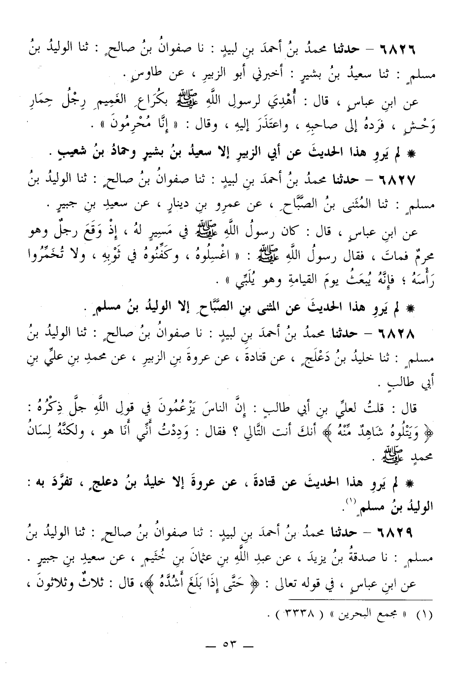 6827 - حَدَّثَنَا مُحَمَّدُ بْنُ أَحْمَدَ بْنِ لَبِيدٍ، ثَنَا صَفْوَانُ بْنُ صَالِحٍ، ثَنَا الْوَلِيدُ بْنُ مُسْلِمٍ، ثَنَا الْمُثَنَّى بْنُ الصَّبَّاحِ، عَنْ عَمْرِو بْنِ دِينَارٍ، عَنْ سَعِيدِ بْنِ جُبَيْرٍ، عَنِ ابْنِ عَبَّاسٍ قَالَ: كَانَ رَسُولُ اللَّهِ صَلَّى اللهُ عَلَيْهِ وَسَلَّمَ فِي مَسِيرٍ لَهُ، إِذْ وَقَعَ رَجُلٌ وَهُوَ مُحْرِمٌ فَمَاتَ، فَقَالَ رَسُولُ اللَّهِ صَلَّى اللهُ عَلَيْهِ وَسَلَّمَ: «§اغْسِلُوهُ، وَكَفِّنُوهُ فِي ثَوْبِهِ، وَلَا تُخَمِّرُوا رَأْسَهُ، فَإِنَّهُ يُبْعَثُ يَوْمَ الْقِيَامَةِ وَهُوَ يُلَبِّي»