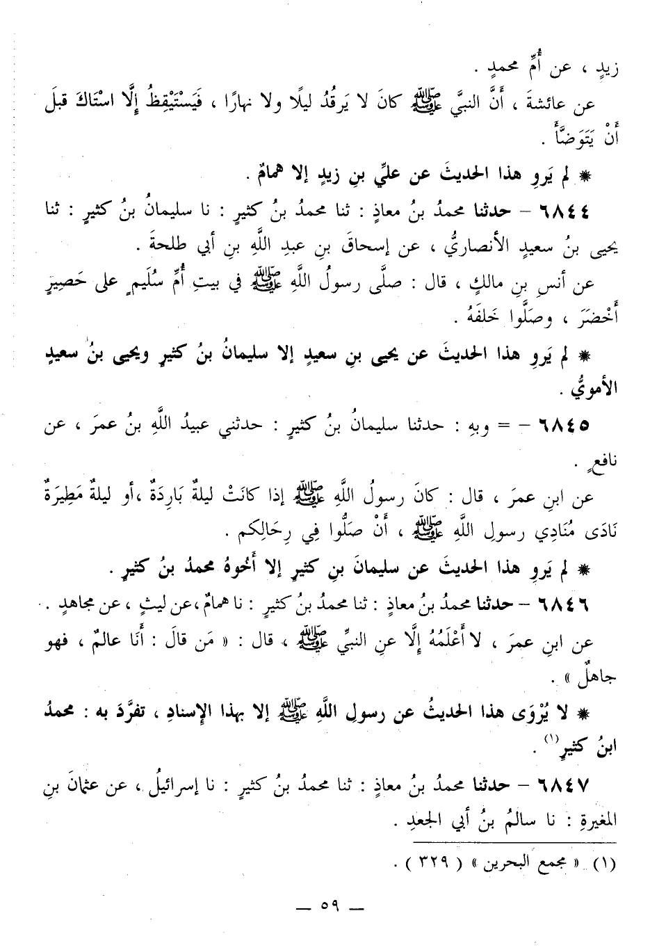 6846 - حَدَّثَنَا مُحَمَّدُ بْنُ مُعَاذٍ، ثَنَا مُحَمَّدُ بْنُ كَثِيرٍ، نَا هَمَّامٌ، عَنْ لَيْثٍ، عَنْ مُجَاهِدٍ، عَنِ ابْنِ عُمَرَ، لَا أَعْلَمُهُ إِلَّا عَنِ النَّبِيِّ صَلَّى اللهُ عَلَيْهِ وَسَلَّمَ قَالَ: «§مَنْ قَالَ أَنَا عَالِمٌ، فَهُوَ جَاهِلٌ»