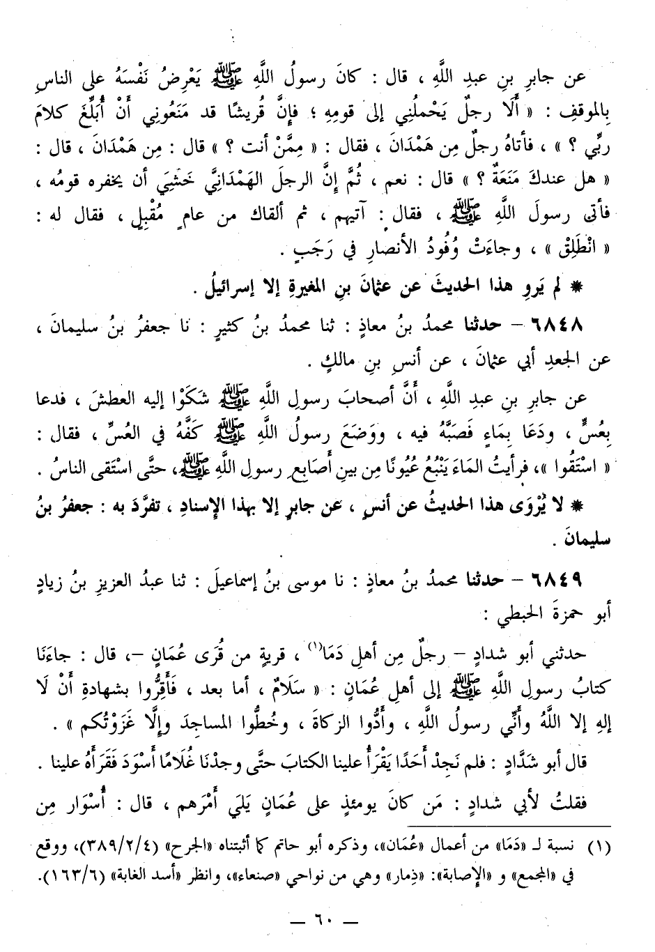 6849 - حَدَّثَنَا مُحَمَّدُ بْنُ مُعَاذٍ، نَا مُوسَى بْنُ إِسْمَاعِيلَ، ثَنَا عَبْدُ الْعَزِيزِ بْنُ زِيَادٍ أَبُو حَمْزَةَ الْحَبَطِيُّ، حَدَّثَنِي أَبُو شَدَّادٍ رَجُلٌ مِنْ أَهْلِ دَمَا، قَرْيَةٍ مِنْ قُرَى عُمَانَ قَالَ: جَاءَنَا كِتَابُ رَسُولِ اللَّهِ صَلَّى اللهُ عَلَيْهِ وَسَلَّمَ إِلَى أَهْلِ عُمَانَ: «§سَلَامٌ، أَمَّا بَعْدُ، فَأَقِرُّوا بِشَهَادَةِ أَنْ لَا إِلَهَ إِلَّا اللَّهُ وَأَنِّي رَسُولُ اللَّهِ، وَأَدُّوا الزَّكَاةَ، وخُطُّوا الْمَسَاجِدَ، وَإِلَّا غَزَوْتُكُمْ» قَالَ أَبُوشَدَّادٍ: «فَلَمْ نَجِدْ أَحَدًا يَقْرَأُ عَلَيْنَا الْكِتَابَ حَتَّى وَجَدْنَا غُلَامًا أَسْوَدَ فَقَرَأَهُ عَلَيْنَا» ، فَقُلْتُ لِأَبِي شَدَّادٍ: مَنْ كَانَ يَوْمَئِذٍ عَلَى عُمَانَ يَلِي أَمْرَهُمْ قَالَ: «أُسْوَارٌ مِنْ -[61]- أَسَاوِرَةِ كِسْرَى، يُقَالُ لَهُ: سَحَانُ»