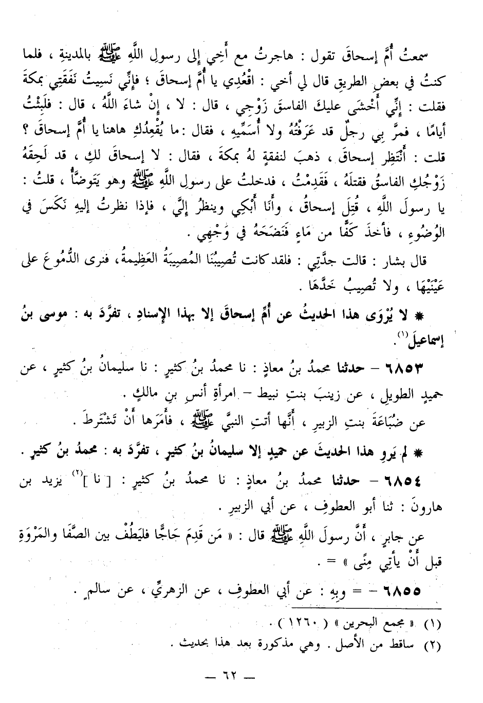 6854 - حَدَّثَنَا مُحَمَّدُ بْنُ مُعَاذٍ، نَا مُحَمَّدُ بْنُ كَثِيرٍ، نَا يَزِيدُ بْنُ هَارُونَ، ثَنَا أَبُو الْعَطُوفِ، عَنْ أَبِي الزُّبَيْرِ، عَنْ جَابِرٍ، أَنَّ رَسُولَ اللَّهِ صَلَّى اللهُ عَلَيْهِ وَسَلَّمَ قَالَ: «§مَنْ قَدِمَ حَاجًّا فَلْيَطُفْ بَيْنَ الصَّفَا وَالْمَرْوَةِ قَبْلَ أَنْ يَأْتِيَ مِنًى»
