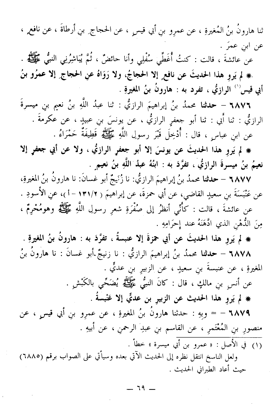 6877 - حَدَّثَنَا مُحَمَّدُ بْنُ إِبْرَاهِيمَ الرَّازِيُّ، نَا زُنَيْجٌ أَبُو غَسَّانَ، نَا هَارُونُ بْنُ الْمُغِيرَةِ، عَنْ عَنْبَسَةَ بْنِ سَعِيدٍ الْقَاضِي، عَنْ أَبِي حَمْزَةَ، عَنْ إِبْرَاهِيمَ، عَنِ الْأَسْوَدِ، عَنْ عَائِشَةَ، قَالَتْ: «كَأَنِّي §أَنْظُرُ إِلَى صُفْرَةِ شَعَرِ رَسُولِ اللَّهِ صَلَّى اللهُ عَلَيْهِ وَسَلَّمَ وَهُوَ مُحْرِمٌ، مِنَ الدُّهْنِ الَّذِي ادَّهَنَهُ عِنْدَ إِحْرَامِهِ»