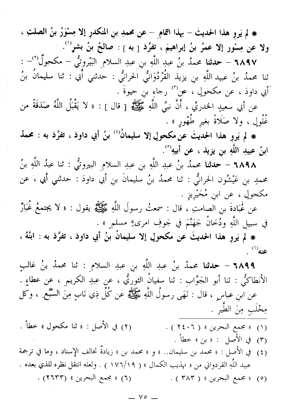 6897 - حَدَّثَنَا مُحَمَّدُ بْنُ عَبْدِ اللَّهِ بْنِ عَبْدِ السَّلَامِ الْبَيْرُوتِيُّ؛ مَكْحُولٌ، ثَنَا مُحَمَّدُ بْنُ عُبَيْدِ اللَّهِ بْنِ يَزِيدَ الْقُرْدُوَانِيُّ الْحَرَّانِيُّ، حَدَّثَنِي أَبِي، ثَنَا سُلَيْمَانُ بْنُ أَبِي دَاوُدَ، عَنْ مَكْحُولٍ، عَنْ رَجَاءَ بْنِ حَيْوَةَ، عَنْ أَبِي سَعِيدٍ الْخُدْرِيِّ، أَنَّ نَبِيَّ اللَّهِ صَلَّى اللهُ عَلَيْهِ وَسَلَّمَ قَالَ: «§لَا يَقْبَلُ اللَّهُ صَدَقَةً مِنْ غُلُولٍ، وَلَا صَلَاةً بِغَيْرِ طُهُورٍ»