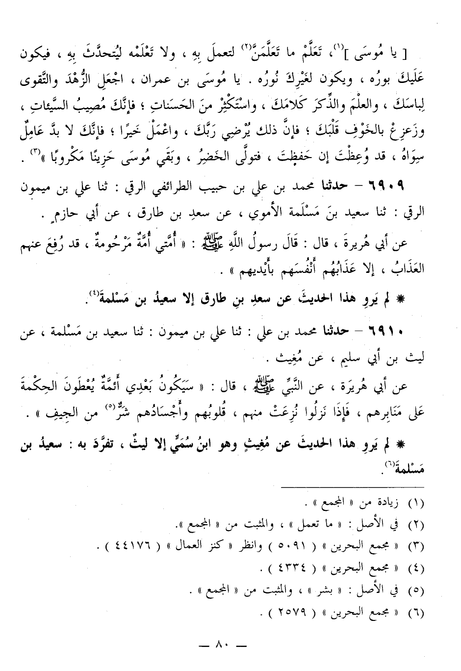 6909 - حَدَّثَنَا مُحَمَّدُ بْنُ عَلِيِّ بْنِ حَبِيبٍ الطَّرَائِفِيُّ الرَّقِّيُّ، ثَنَا عَلِيُّ بْنُ مَيْمُونٍ الرَّقِّيُّ، ثَنَا سَعِيدُ بْنُ مَسْلَمَةَ الْأُمَوِيُّ، عَنْ سَعْدِ بْنِ طَارِقٍ، عَنْ أَبِي حَازِمٍ، عَنْ أَبِي هُرَيْرَةَ قَالَ: قَالَ رَسُولُ اللَّهِ صَلَّى اللهُ عَلَيْهِ وَسَلَّمَ: «§أُمَّتِي أَمَّةٌ مَرْحُومَةٌ، قَدْ رُفِعَ عَنْهُمُ الْعَذَابُ، إِلَّا عَذَابَهُمْ أَنْفُسَهُمْ بِأَيْدِيهِمْ»