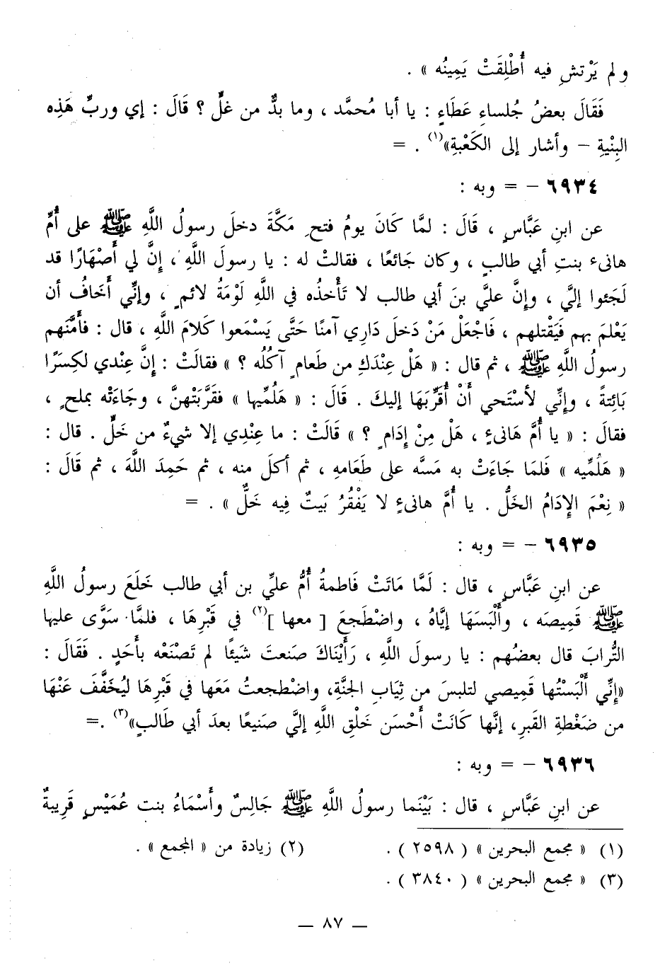 6935 - وَبِهِ: عَنِ ابْنِ عَبَّاسٍ قَالَ: لَمَّا مَاتَتْ فَاطِمَةُ أُمُّ عَلِيِّ بْنِ أَبِي طَالِبٍ خَلَعَ رَسُولُ اللَّهِ صَلَّى اللهُ عَلَيْهِ وَسَلَّمَ قَمِيصَهُ، وأَلْبَسَها إِيَّاهُ، وَاضْطَجَعَ مَعَهَا فِي قَبْرِهَا، فَلَمَّا سَوَّى عَلَيْهَا التُّرَابَ، قَالَ بَعْضُهُمْ: يَا رَسُولَ اللَّهِ رَأَيْنَاكَ صَنَعْتَ شَيْئًا لَمْ تَصْنَعْهُ بِأَحَدٍ، فَقَالَ: «إِنِّي §أَلْبَسْتُها قَمِيصِي لِتَلْبَسَ مِنْ ثِيَابِ الْجَنَّةِ، وَاضْطَجَعْتُ مَعَهَا فِي قَبْرِهَا لَيُخَفَّفَ عَنْهَا مِنْ ضَغْطَةِ الْقَبْرِ، إِنَّهَا كَانَتْ أَحْسَنَ خَلْقِ اللَّهِ إِلَيَّ صَنِيعًا بَعْدَ أَبِي طَالِبٍ»