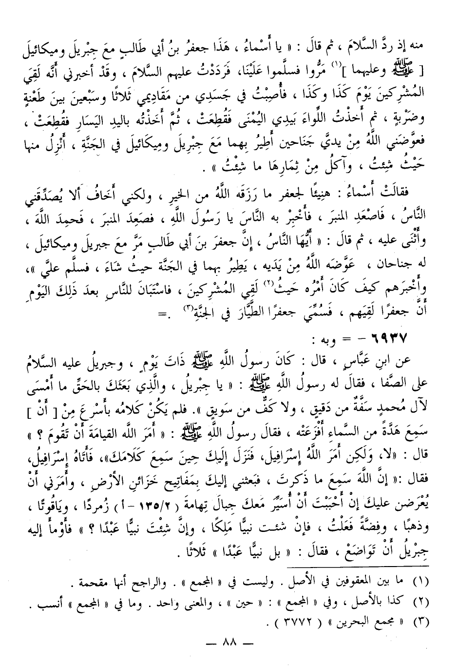 فَقَالَتْ أَسْمَاءُ: هَنِيئًا لِجَعْفَرَ مَا رَزَقَهُ اللَّهُ مِنَ الْخَيْرِ، وَلَكِنِّي أَخَافُ أَلَّا يُصَدِّقَنِي النَّاسُ، فاصْعَدِ الْمِنْبَرَ، فَأُخْبِرْ بِهِ النَّاسَ يَا رَسُولَ اللَّهِ، فَصَعِدَ الْمِنْبَرَ، فَحَمِدَ اللَّهِ، وَأَثْنَى عَلَيْهِ، ثُمَّ قَالَ: «أَيُّهَا النَّاسُ، إِنَّ §جَعْفَرَ بْنَ أَبِي طَالِبٍ مَرَّ مَعَ جِبْرِيلَ وَمِيكَائِيلَ، لَهُ جَنَاحَانِ، عَوَّضَهُ اللَّهُ مِنْ يَدَيْهِ، يَطِيرُ بِهِمَا فِي الْجَنَّةِ حَيْثُ شَاءَ، فَسَلَّمَ عَلَيَّ» ، وَأَخْبَرَهُمْ كَيْفَ كَانَ أَمْرُهُ حَيْثُ لَقِيَ الْمُشْرِكِينَ، فاسْتَبَانَ لِلنَّاسِ بَعْدَ ذَلِكَ الْيَوْمَ أَنَّ جَعْفَرًا لَقِيَهُمْ، فَسُمِّيَ جَعْفَرًا الطَّيَّارَ فِي الْجَنَّةِ