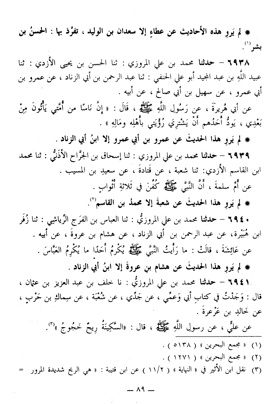 6938 - حَدَّثَنَا مُحَمَّدُ بْنُ عَلِيٍّ الْمَرْوَزِيُّ، ثَنَا الْحَسَنُ بْنُ يَحْيَى الْأَزْدِيُّ، ثَنَا عُبَيْدُ اللَّهِ بْنُ عَبْدِ الْمَجِيدِ أَبُو عَلِيٍّ الْحَنَفِيُّ، ثَنَا عَبْدُ الرَّحْمَنِ بْنُ أَبِي الزِّنَادِ، عَنْ عَمْرِو بْنِ أَبِي عَمْرٍو، عَنْ سُهَيْلِ بْنِ أَبِي صَالِحٍ، عَنْ أَبِيهِ، عَنْ أَبِي هُرَيْرَةَ، عَنْ رَسُولِ اللَّهِ صَلَّى اللهُ عَلَيْهِ وَسَلَّمَ قَالَ: «إِنَّ §نَاسًا مِنْ أُمَّتِي يَأْتُونَ مِنْ بَعْدِي، يَوَدُّ أَحَدُهُمْ أَنْ يَشْتَرِيَ رُؤْيَتِي بِأَهْلِهِ وَمَالِهِ»
