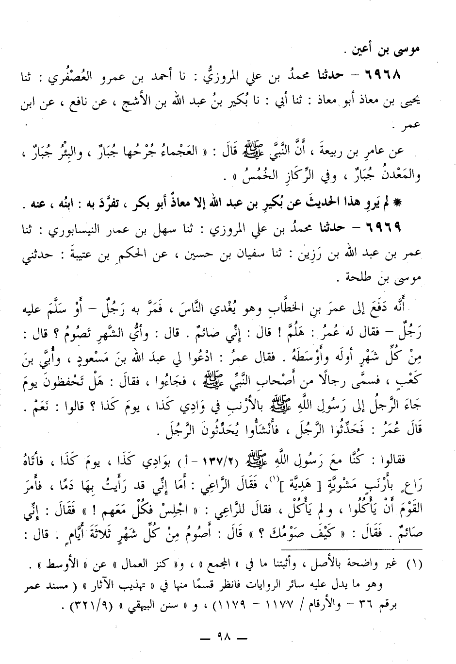 6969 - حَدَّثَنَا مُحَمَّدُ بْنُ عَلِيٍّ الْمَرْوَزِيُّ، ثَنَا سَهْلُ بْنُ عَمَّارٍ النَّيْسَابُورِيُّ، ثَنَا عُمَرُ بْنُ عَبْدِ اللَّهِ بْنِ رَزِينٍ، ثَنَا سُفْيَانُ بْنُ حُسَيْنٍ، عَنِ الْحَكَمِ بْنِ عُتَيْبَةَ، حَدَّثَنِي مُوسَى بْنُ طَلْحَةَ، أَنَّهُ دَفَعَ إِلَى عُمَرَ بْنِ الْخَطَّابِ وَهُوَ يُغَدِّي النَّاسَ، فَمَرَّ بِهِ رَجُلٌ، أَوْ سَلَّمَ عَلَيْهِ رَجُلٌ، فَقَالَ لَهُ عُمَرُ: هَلُمَّ قَالَ: إِنِّي صَائِمٌ. قَالَ: وَأَيُّ الشَّهْرِ تَصُومُ؟ قَالَ: مِنْ كُلِّ شَهْرٍ أَوَّلَهُ وَأَوْسَطَهُ. فَقَالَ عُمَرُ: ادْعُوا لِي عَبْدَ اللَّهِ بْنَ مَسْعُودٍ، وَأُبِيَّ بْنَ كَعْبٍ، فَسَمَّى رِجَالًا مِنْ أَصْحَابِ النَّبِيِّ صَلَّى اللهُ عَلَيْهِ وَسَلَّمَ، فَجَاءُوا، فَقَالَ: هَلْ تَحْفَظُونَ يَوْمَ جَاءَ الرَّجُلُ إِلَى رَسُولِ اللَّهِ صَلَّى اللهُ عَلَيْهِ وَسَلَّمَ بِالْأَرْنَبِ فِي وَادِي كَذَا، يَوْمَ كَذَا؟ قَالُوا: نَعَمْ. قَالَ عُمَرُ: فَحَدِّثُوا الرَّجُلَ، فأَنْشَئُوا يُحَدِّثُونَ الرَّجُلَ. فَقَالُوا: كُنَّا مَعَ رَسُولِ اللَّهِ صَلَّى اللهُ عَلَيْهِ وَسَلَّمَ بِوَادِي كَذَا، يَوْمَ كَذَا، فَأَتَاهُ رَاعٍ بِأَرْنَبٍ مَشْوِيَّةٍ هَدِيَّةً، فَقَالَ الرَّاعِي: أَمَا إِنِّي قَدْ رَأَيْتُ بِهَا دَمًا، فَأَمَرَ الْقَوْمَ أَنْ يَأْكُلُوا، وَلَمْ يَأْكُلْ، فَقَالَ لِلرَّاعِي: «اجْلِسْ فَكُلْ مَعَهُمْ» فَقَالَ: إِنِّي صَائِمٌ. فَقَالَ: «كَيْفَ صَوْمُكَ؟» قَالَ: أَصُومُ مِنْ كُلِّ شَهْرٍ ثَلَاثَةَ أَيَّامٍ. قَالَ: «-[99]- وَأَيُّ ثَلَاثَةٍ تَصُومُ؟» قَالَ: مِنْ أَوْسَطِهِ وَآخِرِهِ، وَكَمَا يَكُونُ. فَقَالَ رَسُولُ اللَّهِ صَلَّى اللهُ عَلَيْهِ وَسَلَّمَ: «§صُمِ الثَّلَاثَةَ الْبِيضَ»