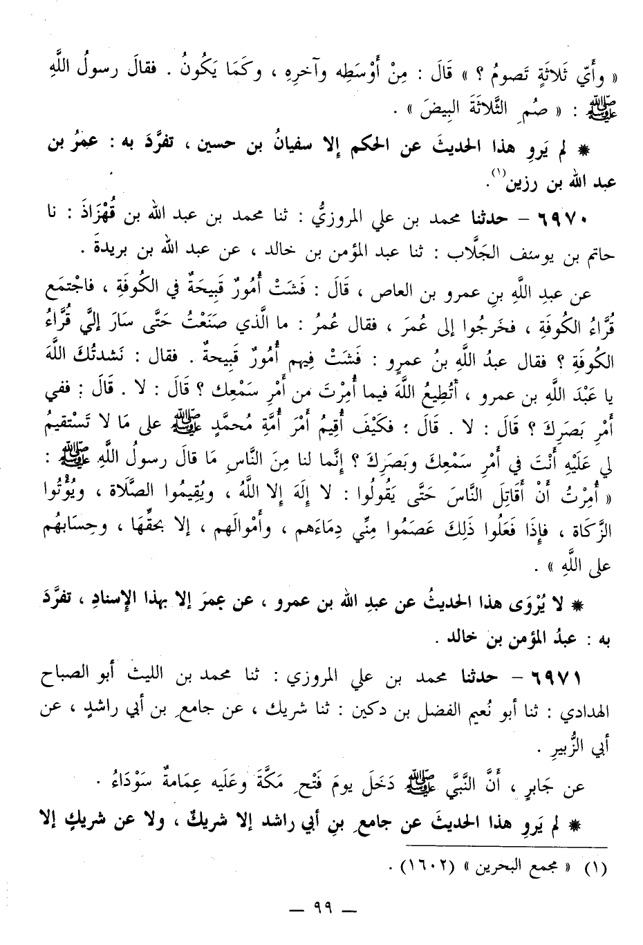 6970 - حَدَّثَنَا مُحَمَّدُ بْنُ عَلِيٍّ الْمَرْوَزِيُّ، ثَنَا مُحَمَّدُ بْنُ عَبْدِ اللَّهِ بْنِ قُهْزَاذَ، نَا حَاتِمُ بْنُ يُوسُفَ الْجَلَّابُ، ثَنَا عَبْدُ الْمُؤْمِنِ بْنُ خَالِدٍ، عَنْ عَبْدِ اللَّهِ بْنِ بُرَيْدَةَ، عَنْ عَبْدِ اللَّهِ بْنِ عَمْرِو بْنِ الْعَاصِ قَالَ: فَشَتْ أُمُورٌ قَبِيحَةٌ فِي الْكُوفَةِ، فَاجْتَمَعَ قُرَّاءُ الْكُوفَةِ، فَخَرَجُوا إِلَى عُمَرَ، فَقَالَ عُمَرُ: مَا الَّذِي صَنَعْتُ حَتَّى سَارَ إِلَيَّ قُرَّاءُ الْكُوفَةِ؟ فَقَالَ عَبْدُ اللَّهِ بْنُ عَمْرٍو: فَشَتْ فِيهِمْ أُمُورٌ قَبِيحَةٌ. فَقَالَ: نَشَدْتُكَ اللَّهَ يَا عَبْدَ اللَّهِ بْنَ عَمْرٍو، أَتُطِيعُ اللَّهَ فِيمَا أُمِرْتَ مِنْ أَمْرِ سَمْعِكَ؟ قَالَ: لَا. قَالَ: فَفِي أَمْرِ بَصَرِكَ؟ قَالَ: لَا. قَالَ: فَكَيْفَ أُقِيمَ أَمْرَ أُمَّةِ مُحَمَّدٍ صَلَّى اللهُ عَلَيْهِ وَسَلَّمَ عَلَى مَا لَا تَسْتَقِيمُ لِي عَلَيْهِ أَنْتَ فِي أَمْرِ سَمْعِكَ وَبَصَرِكَ؟، إِنَّمَا لَنَا مِنَ النَّاسِ مَا قَالَ رَسُولُ اللَّهِ صَلَّى اللهُ عَلَيْهِ وَسَلَّمَ: «§أُمِرْتُ أَنْ أُقَاتِلَ النَّاسَ حَتَّى يَقُولُوا، لَا إِلَهَ إِلَّا اللَّهُ، وَيُقِيمُوا الصَّلَاةَ، وَيُؤْتُوا الزَّكَاةَ، فَإِذَا فَعَلُوا ذَلِكَ عَصَمُوا مِنِّي دِماءَهُمْ، وَأَمْوَالَهُمْ، إِلَّا بِحَقِّهَا، وَحِسَابُهُمْ عَلَى اللَّهِ»
