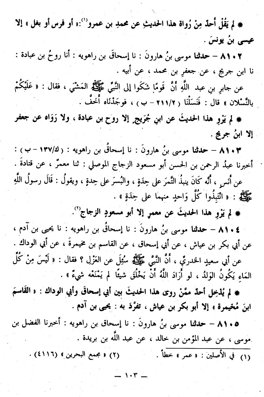8103 - حَدَّثَنَا مُوسَى بْنُ هَارُونَ، نا إِسْحَاقُ بْنُ رَاهَوَيْهِ، أَخْبَرَنَا عَبْدُ الرَّحْمَنِ بْنُ الْحَسَنِ أَبُو مَسْعُودٍ الزَّجَّاجُ الْمُوصِلِيُّ، ثَنَا مَعْمَرٌ، عَنْ قَتَادَةَ، عَنْ أَنَسٍ: أَنَّهُ كَانَ يَنْبِذُ التَّمْرَ عَلَى حِدَةٍ، وَالْبُسْرَ عَلَى حِدَةٍ، وَيَقُولُ: قَالَ رَسُولُ اللَّهِ صَلَّى اللهُ عَلَيْهِ وَسَلَّمَ: «§انْتَبِذُوا كُلَّ وَاحِدٍ مِنْهُمَا عَلَى حِدَةٍ»