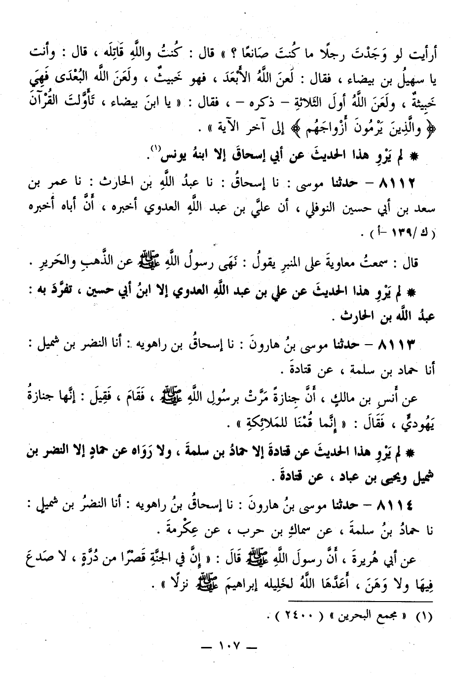 8114 - حَدَّثَنَا مُوسَى بْنُ هَارُونَ، نا إِسْحَاقُ بْنُ رَاهَوَيْهِ، أَنَا النَّضْرُ بْنُ شُمَيْلٍ، نا حَمَّادُ بْنُ سَلَمَةَ، عَنْ سِمَاكِ بْنِ حَرْبٍ، عَنْ عِكْرِمَةَ، عَنْ أبِي هُرَيْرَةَ، أَنَّ رَسُولَ اللَّهِ صَلَّى اللهُ عَلَيْهِ وَسَلَّمَ قَالَ: «§إِنَّ فِي الْجَنَّةِ قَصْرًا مِنْ دُرَّةٍ، لَا صَدْعَ فِيهَا وَلَا وَهَنَ، أَعَدَّهَا اللَّهُ لِخَلِيلِهِ إِبْرَاهِيمَ صَلَّى اللهُ عَلَيْهِ وَسَلَّمَ نُزُلًا» -[108]- لَمْ يَرْوِ هَذَا الْحَدِيثَ عَنْ سِمَاكٍ إِلَّا حَمَّادُ بْنُ سَلَمَةَ، وَلَا رَوَاهُ عَنْ حَمَّادٍ إِلَّا النَّضْرُ بْنُ شُمَيْلٍ، وَيَزِيدُ بْنُ هَارُونَ "
