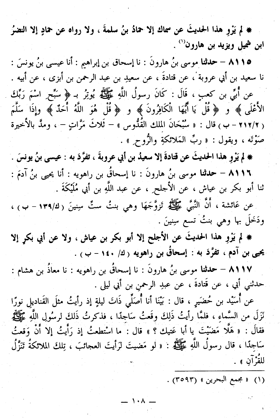 8115 - حَدَّثَنَا مُوسَى بْنُ هَارُونَ، نا إِسْحَاقُ بْنُ إِبْرَاهِيمَ، أَنَا عِيسَى بْنُ يُونُسَ، نا سَعِيدُ بْنُ أَبِي عَرُوبَةَ، عَنْ قَتَادَةَ، عَنْ سَعِيدِ بْنِ عَبْدِ الرَّحْمَنِ بْنِ أَبْزَى، عَنْ أَبِيهِ، عَنْ أُبَيِّ بْنِ كَعْبٍ قَالَ: كَانَ رَسُولُ اللَّهِ صَلَّى اللهُ عَلَيْهِ وَسَلَّمَ «يُوتِرُ بِ سَبَّحِ اسْمَ رَبِّكَ الْأَعْلَى، وَقُلْ يَا أَيُّهَا الْكَافِرُونَ، وَقُلْ هُوَ اللَّهُ أَحَدٌ» ، §وَإِذَا سَلَّمَ قَالَ: «سُبْحَانَ الْمَلَكُ الْقُدُّوسُ» ثَلَاثَ مَرَّاتٍ، وَمَدَّ بِالْأَخِيرَةِ صَوْتَهُ، وَيَقُولُ: «رَبُّ الْمَلَائِكَةِ وَالرُّوحِ»