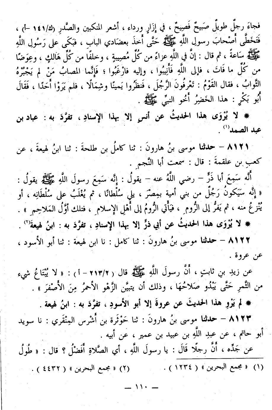 8121 - حَدَّثَنَا مُوسَى بْنُ هَارُونَ، ثَنَا كَامِلُ بْنُ طَلْحَةَ، ثَنَا ابْنُ لَهِيعَةَ، عَنْ كَعْبِ بْنِ عَلْقَمَةَ قَالَ: سَمِعْتُ أَبَا النَّجْمِ، أَنَّهُ سَمِعَ أَبَا ذَرٍّ، رَضِيَ اللَّهُ عَنْهُ، يَقُولُ: إِنَّهُ سَمِعَ رَسُولَ اللَّهِ صَلَّى اللهُ عَلَيْهِ وَسَلَّمَ يَقُولُ: «إِنَّهُ §سَيَكُونُ رَجُلٌ مِنْ بَنِي أُمَيَّةَ بِمِصْرَ يَلِي سُلْطَانًا، ثُمَّ يَغْلِبُ عَلَى سُلْطَانِهِ، أَوْ يَنْزِعُ مِنْهُ، ثُمَّ يَفِرُّ إِلَى الرُّومِ، فَيَأْتِي الرُّومُ إِلَى أَهْلِ الْإِسْلَامِ، فَتِلْكَ أَوَّلُ الْمَلَاحِمِ»
