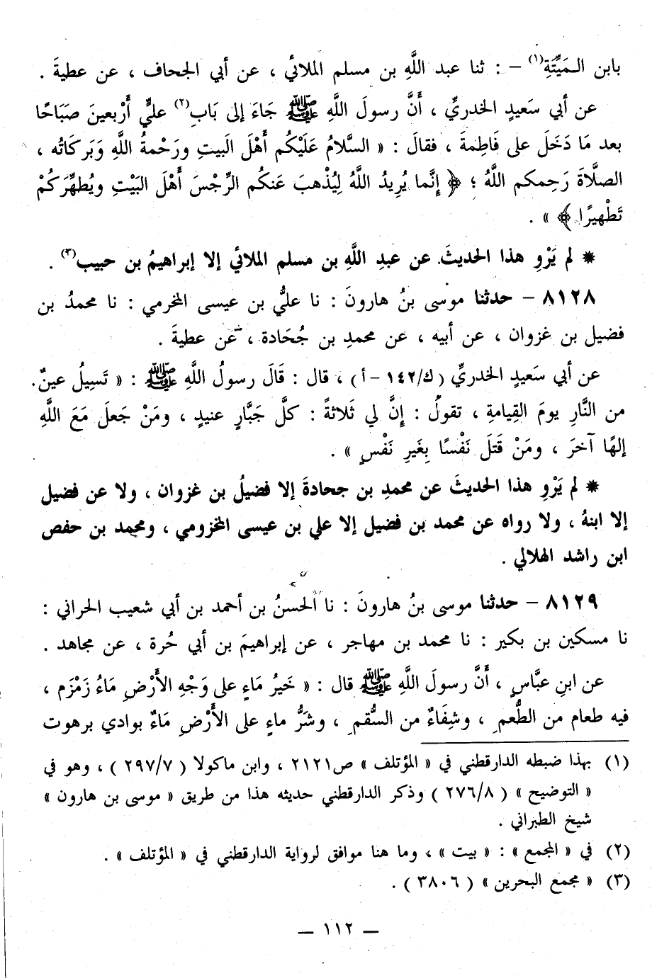8128 - حَدَّثَنَا مُوسَى بْنُ هَارُونَ، نا عَلِيُّ بْنُ عِيسَى الْمَخْرَمِيُّ، نا مُحَمَّدُ بْنُ فُضَيْلِ بْنِ غَزْوَانَ، عَنْ أَبِيهِ , عَنْ مُحَمَّدِ بْنِ جُحَادَةَ، عَنْ عَطِيَّةَ، عَنْ أَبِي سَعِيدٍ الْخُدْرِيِّ قَالَ: قَالَ رَسُولُ اللَّهِ صَلَّى اللهُ عَلَيْهِ وَسَلَّمَ: «§تَسِيلُ عَيْنٌ مِنَ النَّارِ يَوْمَ الْقِيَامَةِ، تَقُولُ: إِنَّ لِي ثَلَاثَةً: كُلُّ جَبَّارٍ عَنِيدٍ، وَمَنْ جَعَلَ مَعَ اللَّهِ إِلَهًا آخَرَ، وَمَنْ قَتَلَ نَفْسًا بِغَيْرِ نَفْسٍ»