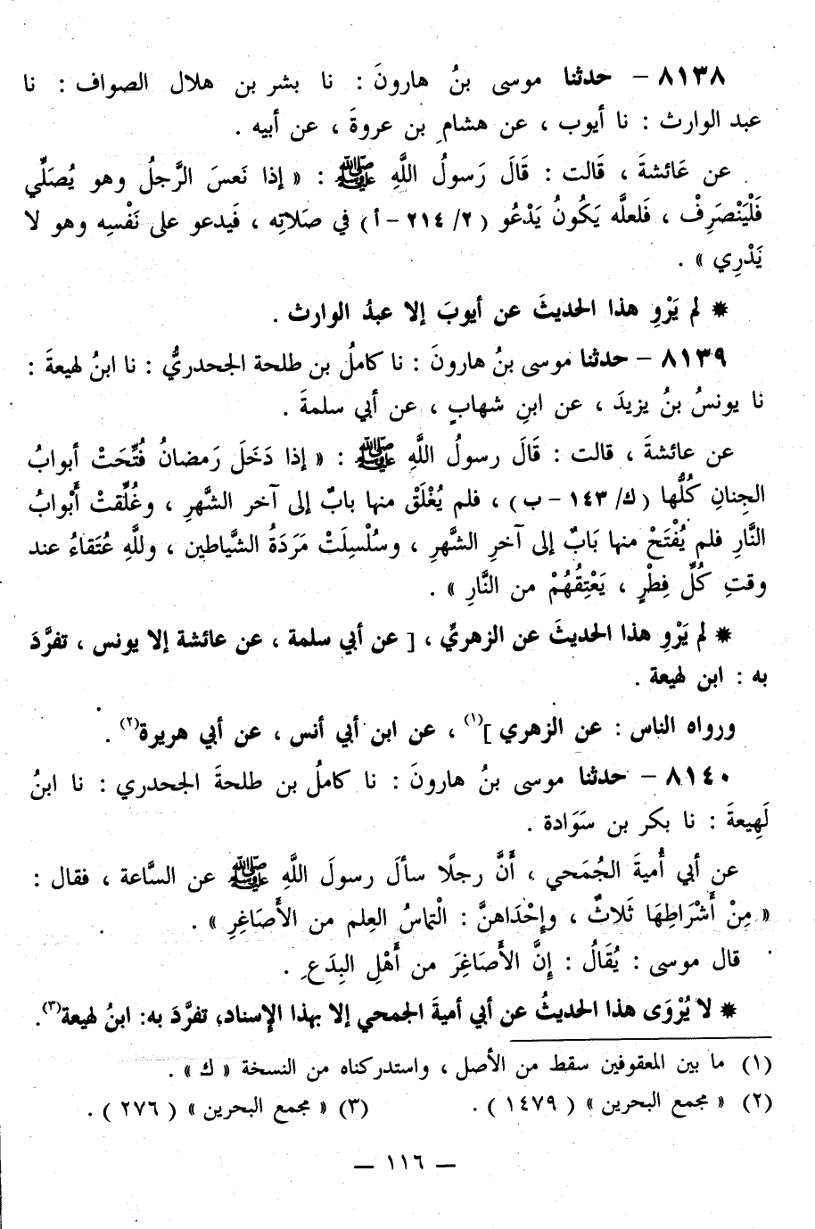 8140 - حَدَّثَنَا مُوسَى بْنُ هَارُونَ، نا كَامِلُ بْنُ طَلْحَةَ الْجَحْدَرِيُّ، نا ابْنُ لَهِيعَةَ، نا بَكْرُ بْنُ سَوَادَةَ، عَنْ أَبِي أُمَيَّةَ الْجُمَحِيِّ، أَنَّ رَجُلًا سَأَلَ رَسُولَ اللَّهِ صَلَّى اللهُ عَلَيْهِ وَسَلَّمَ عَنِ §السَّاعَةِ، فَقَالَ: «مِنْ أَشْرَاطِهَا ثَلَاثٌ، وَإِحْدَاهُنَّ: الْتِمَاسُ الْعِلْمِ مِنَ الْأَصَاغِرِ» قَالَ مُوسَى: «يُقَالُ: إِنَّ الْأَصَاغِرَ مِنَ أَهْلِ الْبِدَعِ» لَا يَرْوِي هَذَا الْحَدِيثِ عَنْ أَبِي أُمَيَّةَ الْجُحَمِيِّ إِلَّا بِهَذَا الْإِسْنَادِ، تَفَرَّدَ بِهِ: ابْنُ لَهِيعَةَ "