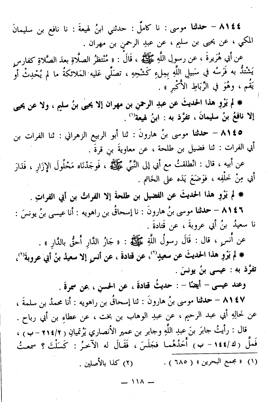 8144 - حَدَّثَنَا مُوسَى، نا كَامِلٌ، حَدَّثَنِي ابْنُ لَهِيعَةَ، نا نَافِعُ بْنُ سُلَيْمَانَ الْمَكِّيُّ، عَنْ يَحْيَى بْنِ سُلَيْمٍ، عَنْ عَبْدِ الرَّحْمَنِ بْنِ مِهْرَانَ، عَنْ أَبِي هُرَيْرَةَ، عَنْ رَسُولِ اللَّهِ صَلَّى اللهُ عَلَيْهِ وَسَلَّمَ قَالَ: «§مُنْتَظِرُ الصَّلَاةِ بَعْدَ الصَّلَاةِ كَفَارِسٍ يَشْتَدُّ بِهِ فَرَسُهُ فِي سَبِيلِ اللَّهِ بِمِلْءِ كَشْحِهِ، تُصَلِّي عَلَيْهِ الْمَلَائِكَةُ مَا لَمْ يُحْدِثْ أَوْ يَقُمْ، وَهُوَ فِي الرِّبَاطِ الْأَكْبَرِ»