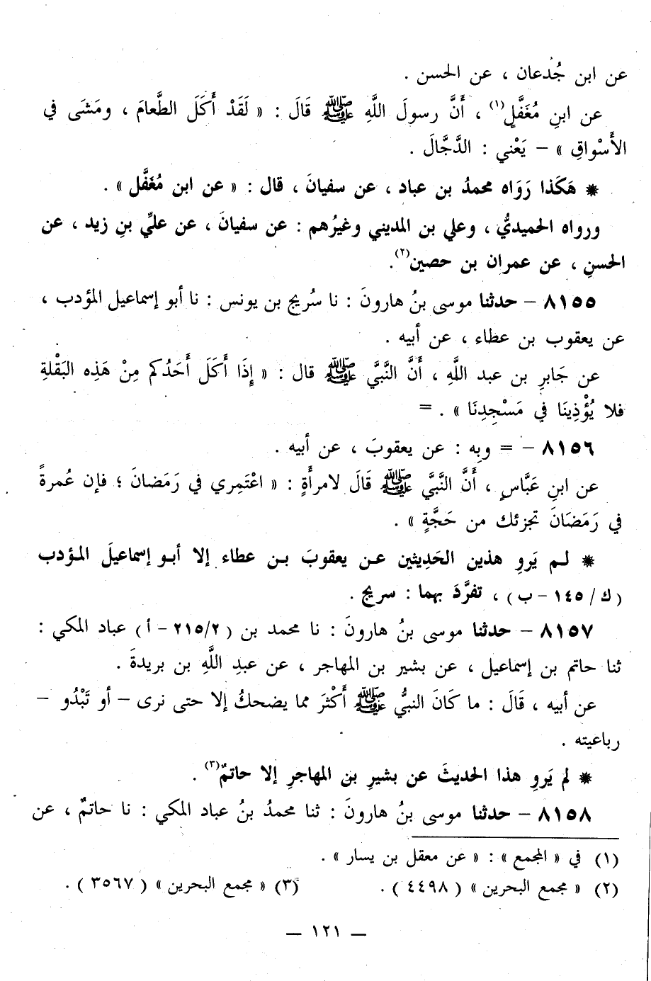 8155 - حَدَّثَنَا مُوسَى بْنُ هَارُونَ، نا سُرَيْجُ بْنُ يُونُسَ، نا أَبُو إِسْمَاعِيلَ الْمُؤَدِّبُ، عَنْ يَعْقُوبَ بْنِ عَطَاءٍ، عَنْ أَبِيهِ، عَنْ جَابِرِ بْنِ عَبْدِ اللَّهِ، أَنَّ النَّبِيَّ صَلَّى اللهُ عَلَيْهِ وَسَلَّمَ قَالَ: «§إِذَا أَكَلَ أَحَدُكُمْ مِنْ هَذِهِ الْبَقْلَةِ فَلَا يُؤْذِينَا فِي مَسْجِدِنَا»