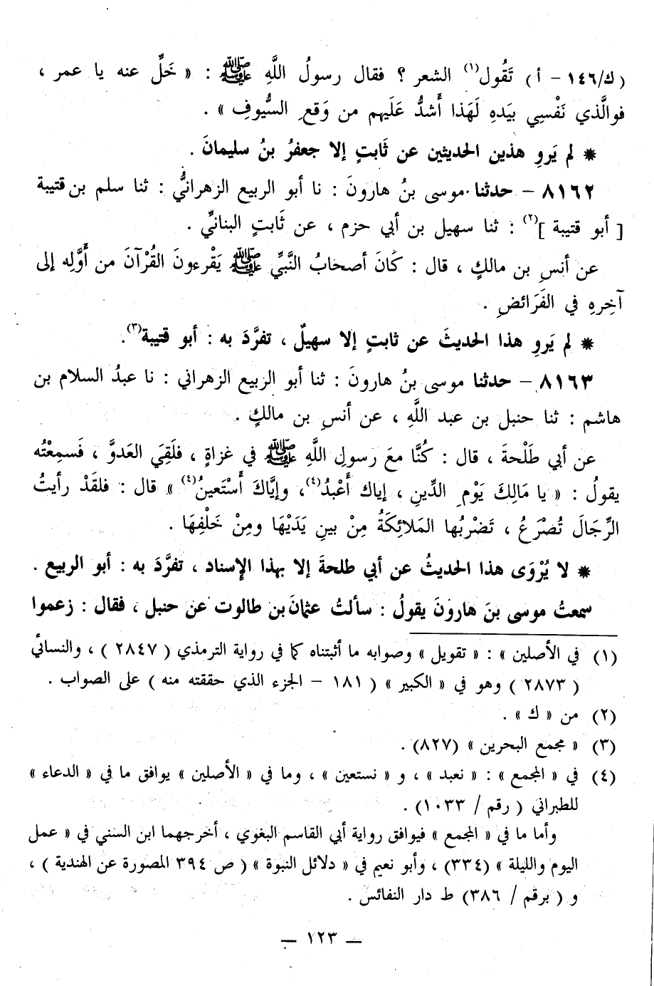 8162 - حَدَّثَنَا مُوسَى بْنُ هَارُونَ، نا أَبُو الرَّبِيعِ الزَّهْرَانِيُّ، ثَنَا سَلْمُ بْنُ قُتَيْبَةَ أَبُو قُتَيْبَةَ، ثَنَا سُهَيْلُ بْنُ أَبِي حَزْمٍ، عَنْ ثَابِتٍ الْبُنَانِيِّ، عَنْ أَنَسِ بْنِ مَالِكٍ قَالَ: «كَانَ §أَصْحَابُ النَّبِيِّ صَلَّى اللهُ عَلَيْهِ وَسَلَّمَ يَقْرَءُونَ الْقُرْآنَ مِنْ أَوَّلِهِ إِلَى آخِرِهِ فِي الْفَرَائِضِ»