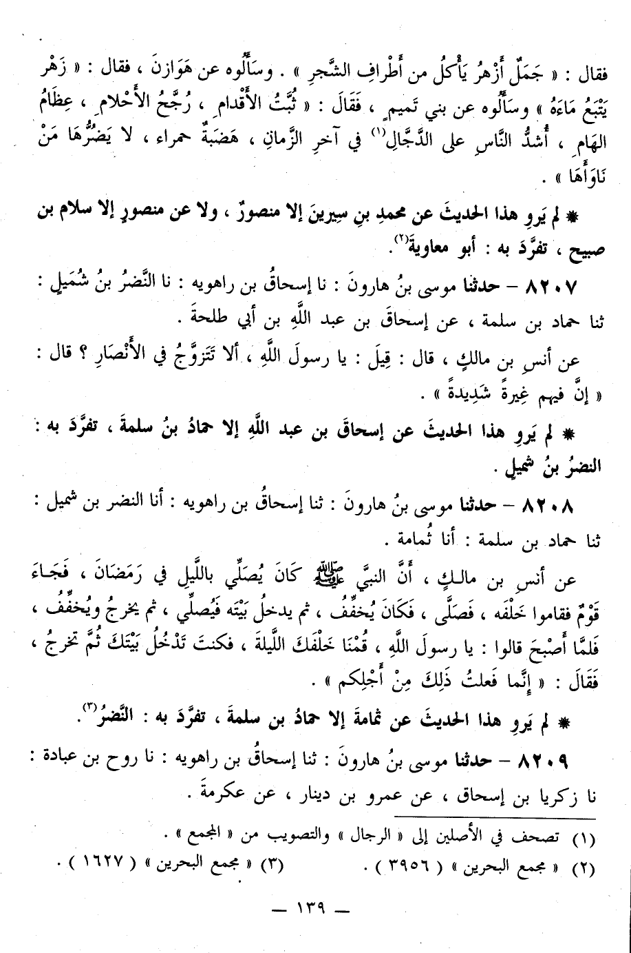 8208 - حَدَّثَنَا مُوسَى بْنُ هَارُونَ، ثَنَا إِسْحَاقُ بْنُ رَاهَوَيْهِ، أَنَا النَّضْرُ بْنُ شُمَيْلٍ، ثَنَا حَمَّادُ بْنُ سَلَمَةَ، أَنَا ثُمَامَةُ، عَنْ أَنَسِ بْنِ مَالِكٍ، أَنَّ النَّبِيَّ صَلَّى اللهُ عَلَيْهِ وَسَلَّمَ كَانَ «يُصَلِّي بِاللَّيْلِ فِي رَمَضَانَ» ، فَجَاءَ قَوْمٌ، فَقَامُوا خَلْفَهُ، «فَصَلَّى فَكَانَ يُخَفَّفُ، ثُمَّ يَدْخُلُ بَيْتَهُ فَيُصَلِّي، ثُمَّ يَخْرُجُ وَيُخَفِّفُ» ، فَلَمَّا أَصْبَحَ قَالُوا: يَا رَسُولَ اللَّهِ، قُمْنَا خَلْفَكَ اللَّيْلَةَ، فَكُنْتَ تَدْخُلُ بَيْتَكَ ثُمَّ تَخْرُجُ، فَقَالَ: «§إِنَّمَا فَعَلْتُ ذَلِكَ مِنْ أَجَلِكُمْ»