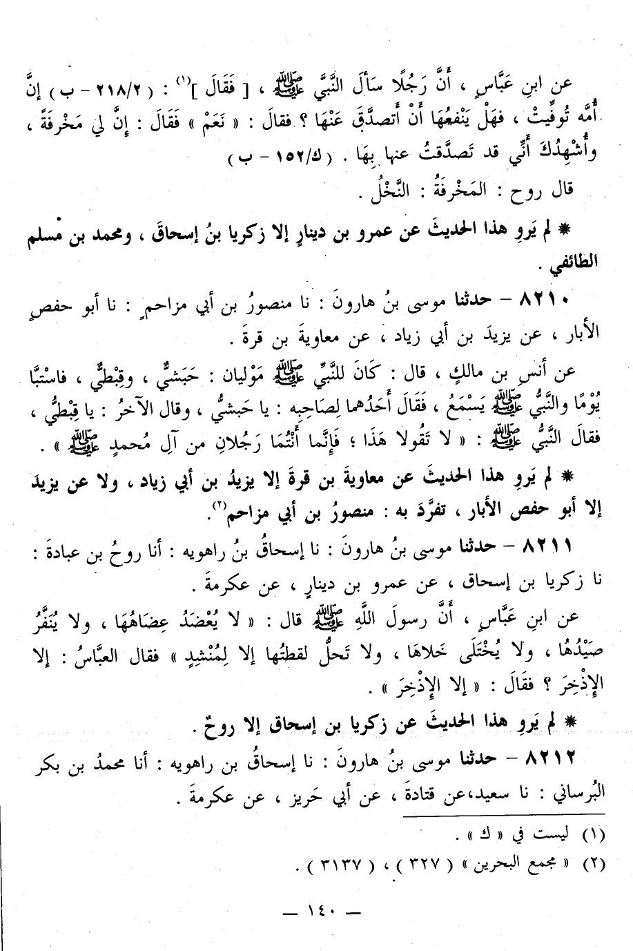 8211 - حَدَّثَنَا مُوسَى بْنُ هَارُونَ، نا إِسْحَاقُ بْنُ رَاهَوَيْهِ، أَنَا رَوْحُ بْنُ عُبَادَةَ، نا زَكَرِيَّا بْنُ إِسْحَاقَ، عَنْ عَمْرِو بْنِ دِينَارٍ، عَنْ عِكْرِمَةَ، عَنِ ابْنِ عَبَّاسٍ، أَنَّ رَسُولَ اللَّهِ صَلَّى اللهُ عَلَيْهِ وَسَلَّمَ قَالَ: «§لَا يُعْضَدُ عِضَاهُهَا، وَلَا يُنَفَّرُ صَيْدُهَا، وَلَا يُخْتَلَى خَلَاهَا، وَلَا تَحِلُّ لُقَطَتُهَا إِلَّا لِمُنْشِدٍ» ، فَقَالَ الْعَبَّاسُ: إِلَّا الْإِذْخِرَ؟ فَقَالَ: «إِلَّا الْإِذْخِرَ»