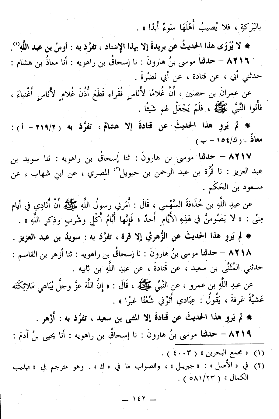 8218 - حَدَّثَنَا مُوسَى بْنُ هَارُونَ، نا إِسْحَاقُ بْنُ رَاهَوَيْهِ، ثَنَا أَزْهَرُ بْنُ الْقَاسِمِ، حَدَّثَنِي الْمُثَنَّى بْنُ سَعِيدٍ، عَنْ قَتَادَةَ، عَنْ عَبْدِ اللَّهِ بْنِ بَابَيْهِ، عَنْ عَبْدِ اللَّهِ بْنِ عَمْرٍو، عَنِ النَّبِيِّ صَلَّى اللهُ عَلَيْهِ وَسَلَّمَ قَالَ: «إِنَّ اللَّهَ عَزَّ وَجَلَّ يُبَاهِي مَلَائِكَتَهُ عَشِيَّةَ عَرَفَةَ، يَقُولُ: §عِبَادِي أَتَوْنِي شُعْثًا غُبْرًا»