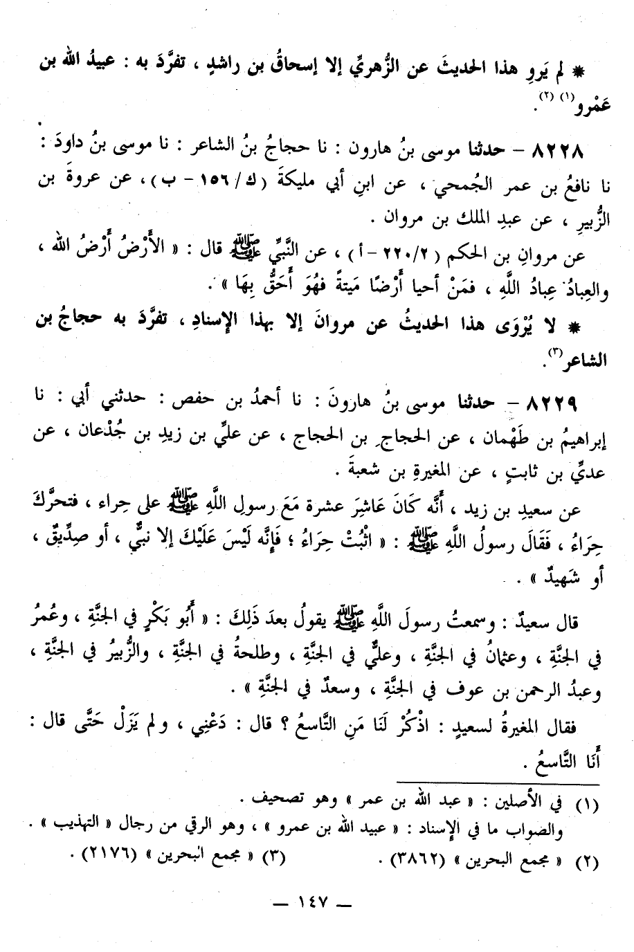 قَالَ سَعِيدٌ: وَسَمِعْتُ رَسُولَ اللَّهِ صَلَّى اللهُ عَلَيْهِ وَسَلَّمَ يَقُولُ بَعْدَ ذَلِكَ: «§أَبُو بَكْرٍ فِي الْجَنَّةِ، وَعُمَرُ فِي الْجَنَّةِ، وَعُثْمَانُ فِي الْجَنَّةِ، وَعَلِيٌّ فِي الْجَنَّةِ، وَطَلْحَةُ فِي الْجَنَّةِ، وَالزُّبَيْرُ فِي الْجَنَّةِ، وَعَبْدُ الرَّحْمَنِ بْنُ عَوْفٍ فِي الْجَنَّةِ، وَسَعْدٌ فِي الْجَنَّةِ» فَقَالَ الْمُغِيرَةُ لِسَعِيدٍ: اذْكُرْ لَنَا مَنِ التَّاسِعِ؟ قَالَ: دَعْنِي، وَلَمْ يَزَلْ حَتَّى قَالَ: أَنَا التَّاسِعُ «-[148]- لَمْ يَرْوِ هَذَا الْحَدِيثَ عَنْ عَدِيِّ بْنِ ثَابِتٍ إِلَّا عَلِيُّ بْنُ زَيْدٍ، وَلَا عَنْ عَلِيٍّ إِلَّا الْحَجَّاجُ، تَفَرَّدَ بِهِ: إِبْرَاهِيمُ بْنُ طَهْمَانَ»