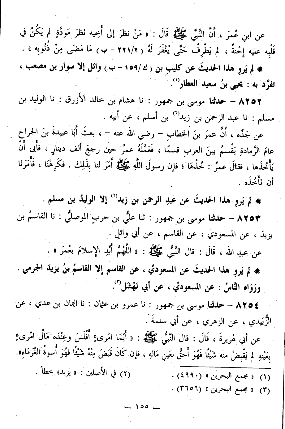 8253 - حَدَّثَنَا مُوسَى بْنُ جُمْهُورٍ، ثَنَا عَلِيُّ بْنُ حَرْبٍ الْمُوصِلِيُّ، نا الْقَاسِمُ بْنُ يَزِيدَ، عَنِ الْمَسْعُودِيِّ، عَنِ الْقَاسِمِ، عَنْ أَبِي وَائِلٍ، عَنْ عَبْدِ اللَّهِ قَالَ: قَالَ النَّبِيُّ صَلَّى اللهُ عَلَيْهِ وَسَلَّمَ: «§اللَّهُمَّ، أَيِّدِ الْإِسْلَامَ بِعُمَرَ»