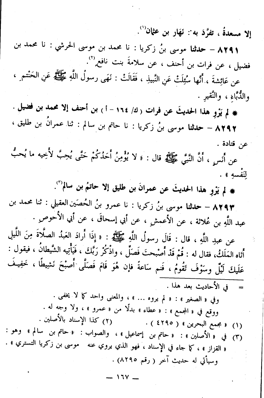 8292 - حَدَّثَنَا مُوسَى بْنُ زَكَرِيَّا، نا حَاتِمُ بْنُ سَالِمٍ، ثَنَا عِمْرَانُ بْنُ طَلِيقٍ، عَنْ قَتَادَةَ، عَنْ أَنَسٍ، أَنَّ النَّبِيَّ صَلَّى اللهُ عَلَيْهِ وَسَلَّمَ قَالَ: «§لَا يُؤْمِنُ أَحَدُكُمْ حَتَّى يُحِبَّ لِأَخِيهِ مَا يُحِبُّ لِنَفْسِهِ»