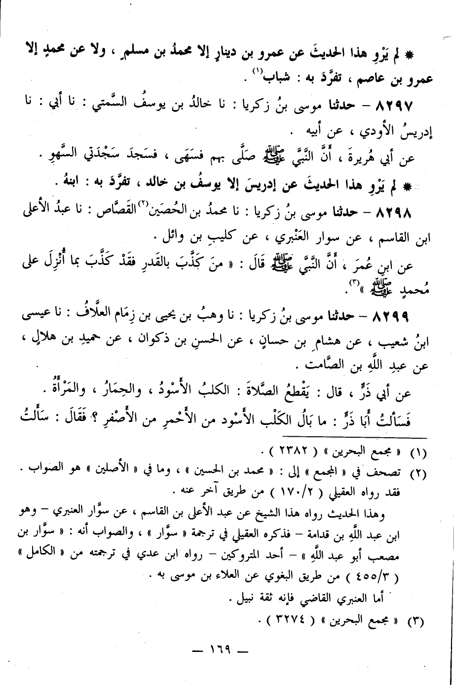 8299 - حَدَّثَنَا مُوسَى بْنُ زَكَرِيَّا، نا وَهْبُ بْنُ يَحْيَى بْنِ زِمَامٍ الْعَلَّافُ، نا عِيسَى بْنُ شُعَيْبٍ، عَنْ هِشَامِ بْنِ حَسَّانٍ، عَنِ الْحَسَنِ بْنِ ذَكْوَانَ، عَنْ حُمَيْدِ بْنِ هِلَالٍ، عَنْ عَبْدِ اللَّهِ بْنِ الصَّامِتِ، عَنْ أَبِي ذَرٍّ قَالَ: يَقْطَعُ الصَّلَاةَ: الْكَلْبُ الْأَسْوَدُ، وَالْحِمَارُ، وَالْمَرْأَةُ، فَسَأَلَتْ أَبَا ذَرٍّ: مَا بَالُ الْكَلْبِ الْأَسْوَدِ مِنَ الْأَحْمَرِ مِنَ الْأَصْفَرِ؟ فَقَالَ: سَأَلْتُ -[170]- رَسُولَ اللَّهِ صَلَّى اللهُ عَلَيْهِ وَسَلَّمَ كَمَا سَأَلَتْنِي، فَقَالَ: «§الْكَلْبُ الْأَسْوَدُ شَيْطَانٌ»