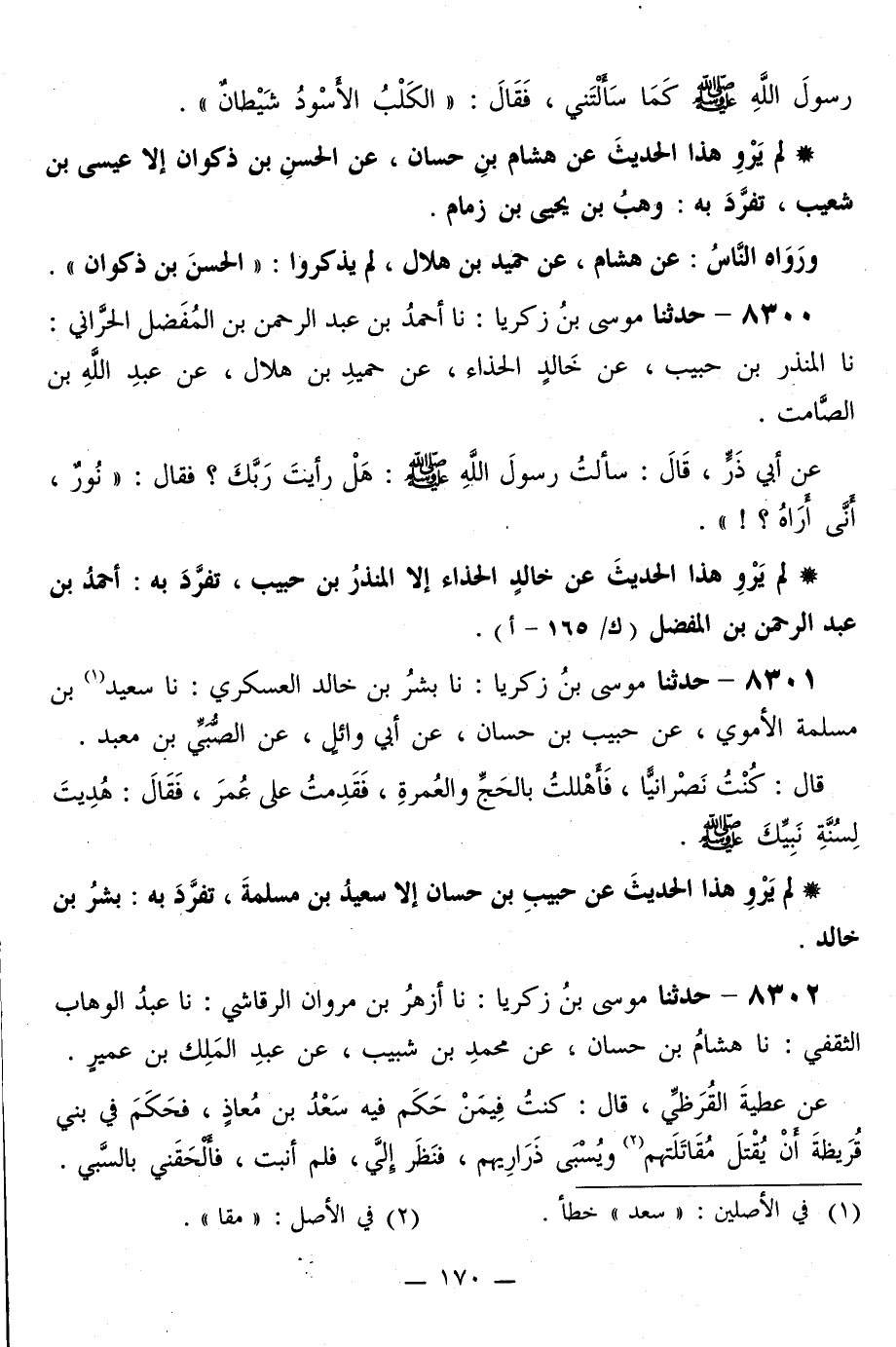 8300 - حَدَّثَنَا مُوسَى بْنُ زَكَرِيَّا، نا أَحْمَدُ بْنُ عَبْدِ الرَّحْمَنِ بْنِ الْمُفَضَّلِ الْحَرَّانِيُّ، نا الْمُنْذِرُ بْنُ حَبِيبٍ، عَنْ خَالِدٍ الْحَذَّاءِ، عَنْ حُمَيْدِ بْنِ هِلَالٍ، عَنْ عَبْدِ اللَّهِ بْنِ الصَّامِتِ، عَنْ أَبِي ذَرٍّ قَالَ: سَأَلْتُ رَسُولَ اللَّهِ صَلَّى اللهُ عَلَيْهِ وَسَلَّمَ: §هَلْ رَأَيْتَ رَبِّكَ؟ فَقَالَ: «نُورٌ، أَنَّى أَرَاهُ»