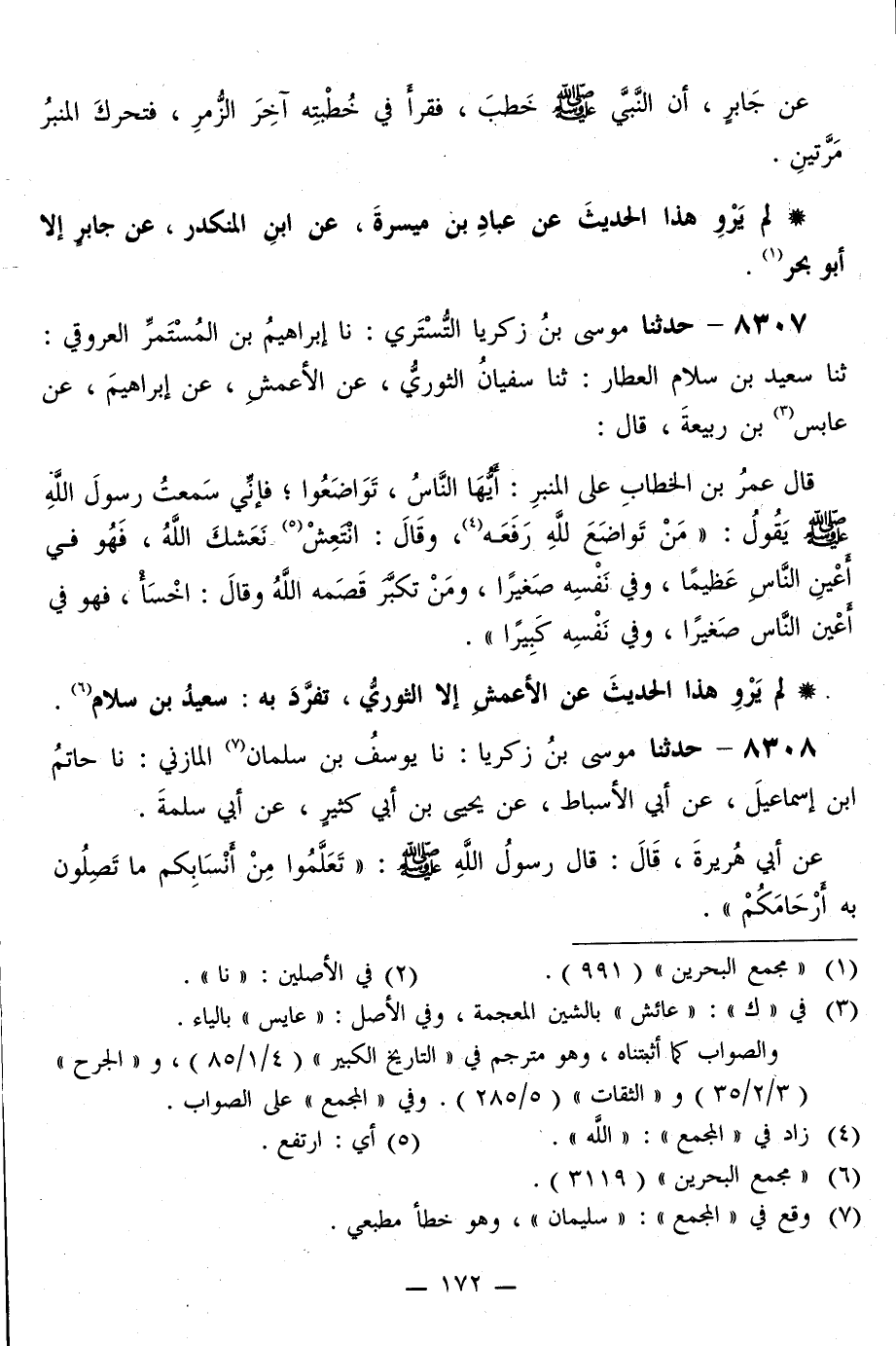 8307 - حَدَّثَنَا مُوسَى بْنُ زَكَرِيَّا التُّسْتَرِيُّ، نا إِبْرَاهِيمُ بْنُ الْمُسْتَمِرِّ الْعُرُوقِيُّ، ثَنَا سَعِيدُ بْنُ سَلَامٍ الْعَطَّارُ، ثَنَا سُفْيَانُ الثَّوْرِيُّ، عَنِ الْأَعْمَشِ، عَنْ إِبْرَاهِيمَ، عَنْ عَابِسِ بْنِ رَبِيعَةَ قَالَ: قَالَ عُمَرُ بْنُ الْخَطَّابِ عَلَى الْمِنْبَرِ: أَيُّهَا النَّاسُ تَوَاضَعُوا، فَإِنِّي سَمِعْتُ رَسُولَ اللَّهِ صَلَّى اللهُ عَلَيْهِ وَسَلَّمَ يَقُولُ: «§مَنْ تَوَاضَعَ لِلَّهِ رَفَعَهُ»