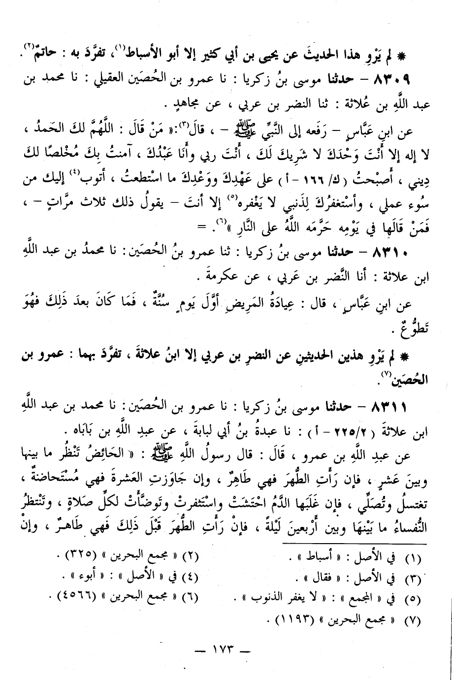 8311 - حَدَّثَنَا مُوسَى بْنُ زَكَرِيَّا، نا عَمْرُو بْنُ الْحُصَيْنِ، نا مُحَمَّدُ بْنُ عَبْدِ اللَّهِ بْنِ عُلَاثَةَ، نا عَبْدَةُ بْنُ أَبِي لُبَابَةَ، عَنْ عَبْدِ اللَّهِ بْنِ بَابَاهْ، عَنْ عَبْدِ اللَّهِ بْنِ عَمْرٍو قَالَ: قَالَ رَسُولُ اللَّهِ صَلَّى اللهُ عَلَيْهِ وَسَلَّمَ: «§الْحَائِضُ تَنْظُرُ مَا بَيْنَهَا وَبَيْنَ عَشْرٍ، فَإِنْ رَأَتِ الطُّهْرَ فَهِيَ طَاهِرٌ، وَإِنْ جَاوَزَتِ الْعَشْرَةَ فَهِيَ مُسْتَحَاضَةٌ تَغْتَسِلُ وَتُصَلِّي، فَإِنْ غَلَبَهَا الدَّمُ احْتَشَتْ، وَاسْتَثْفَرَتْ، وَتَوَضَّأَتْ لِكُلِّ صَلَاةٍ، وَتَنْتَظِرُ النُّفَسَاءُ مَا بَيْنَهَا وَبَيْنَ أَرْبَعِينَ لَيْلَةً، فَإِنْ رَأَتِ الطُّهْرَ قَبْلَ ذَلِكَ فَهِيَ طَاهِرٌ، وَإِنْ -[174]- جَاوَزَتِ الْأَرْبَعِينَ فَهِيَ بِمَنْزِلَةِ الْمُسْتَحَاضَةِ تَغْتَسِلُ وَتُصَلِّي، فَإِنْ غَلَبَهَا الدَّمُ احْتَشَتْ، وَاسْتَثْفَرَتْ وَتَوَضَّأَتْ لِكُلِّ صَلَاةٍ»