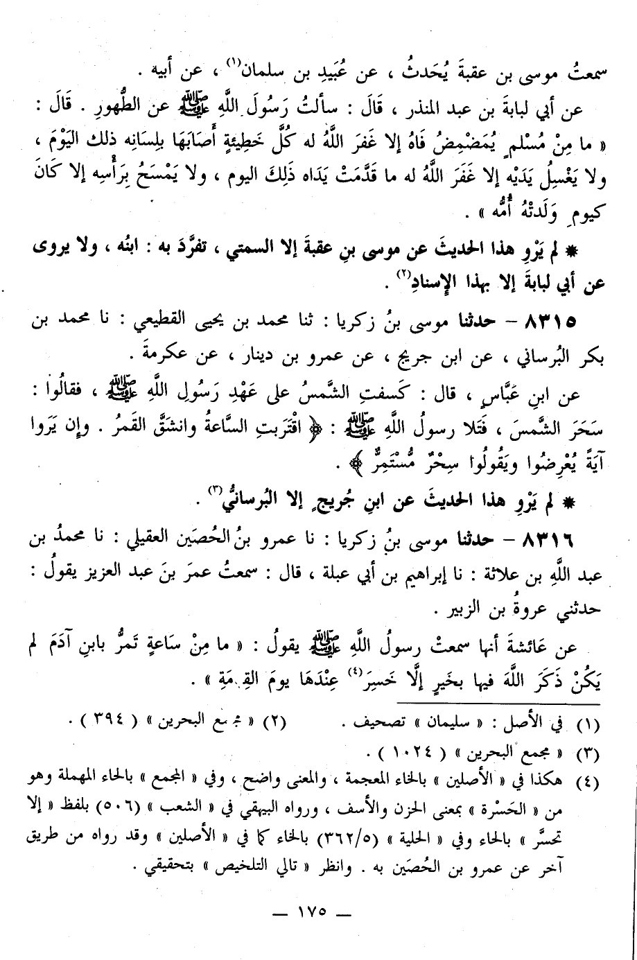 8315 - حَدَّثَنَا مُوسَى بْنُ زَكَرِيَّا، ثَنَا مُحَمَّدُ بْنُ يَحْيَى الْقُطَيْعِيُّ، نا مُحَمَّدُ بْنُ بَكْرٍ الْبُرْسَانِيُّ، عَنِ ابْنِ جُرَيْجٍ، عَنْ عَمْرِو بْنِ دِينَارٍ، عَنْ عِكْرِمَةَ، عَنِ ابْنِ عَبَّاسٍ قَالَ: §كَسَفَتِ الشَّمْسُ عَلَى عَهْدِ رَسُولِ اللَّهِ صَلَّى اللهُ عَلَيْهِ وَسَلَّمَ، فَقَالُوا: سَحَرَ الشَّمْسَ، «فَتَلَا رَسُولُ اللَّهِ صَلَّى اللهُ عَلَيْهِ وَسَلَّمَ: {اقْتَرَبَتِ السَّاعَةُ وَانْشَقَّ} [القمر: 2] الْقَمَرُ وَإِنْ يَرَوْا آيَةً يُعْرِضُوا وَيَقُولُوا سِحْرٌ مُسْتَمِرٌّ»