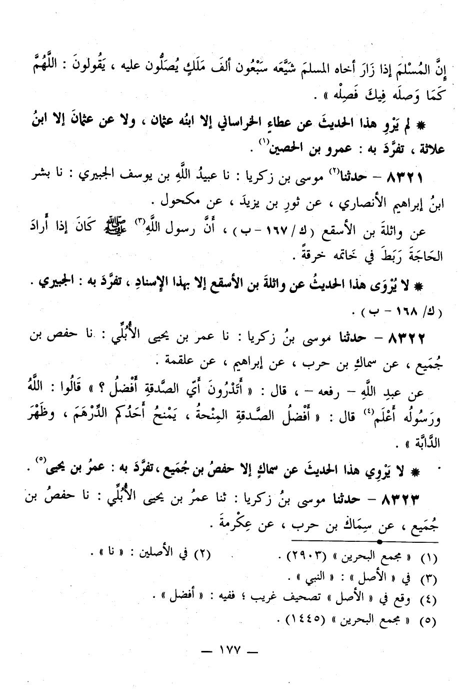 8322 - حَدَّثَنَا مُوسَى بْنُ زَكَرِيَّا، نا عُمَرُ بْنُ يَحْيَى الْأُبُلِّيُّ، نا حَفْصُ بْنُ جُمَيْعٍ، عَنْ سِمَاكِ بْنِ حَرْبٍ، عَنْ إِبْرَاهِيمَ، عَنْ عَلْقَمَةَ، عَنْ عَبْدِ اللَّهِ، رَفَعَهُ قَالَ: «أَتَدْرُونَ أَيَّ الصَّدَقَةِ أَفْضَلُ؟» قَالُوا: اللَّهُ وَرَسُولُهُ أَعْلَمُ. قَالَ: «§أَفْضَلُ الصَّدَقَةِ الْمِنْحَةُ يَمْنَحُ أَحَدُكُمُ الدِّرْهَمَ، وَظَهْرَ الدَّابَّةِ» لَا يَرْوِي هَذَا الْحَدِيثَ عَنْ سِمَاكٍ إِلَّا حَفْصُ بْنُ جُمَيْعٍ، تَفَرَّدَ بِهِ: عُمَرُ بْنُ يَحْيَى "