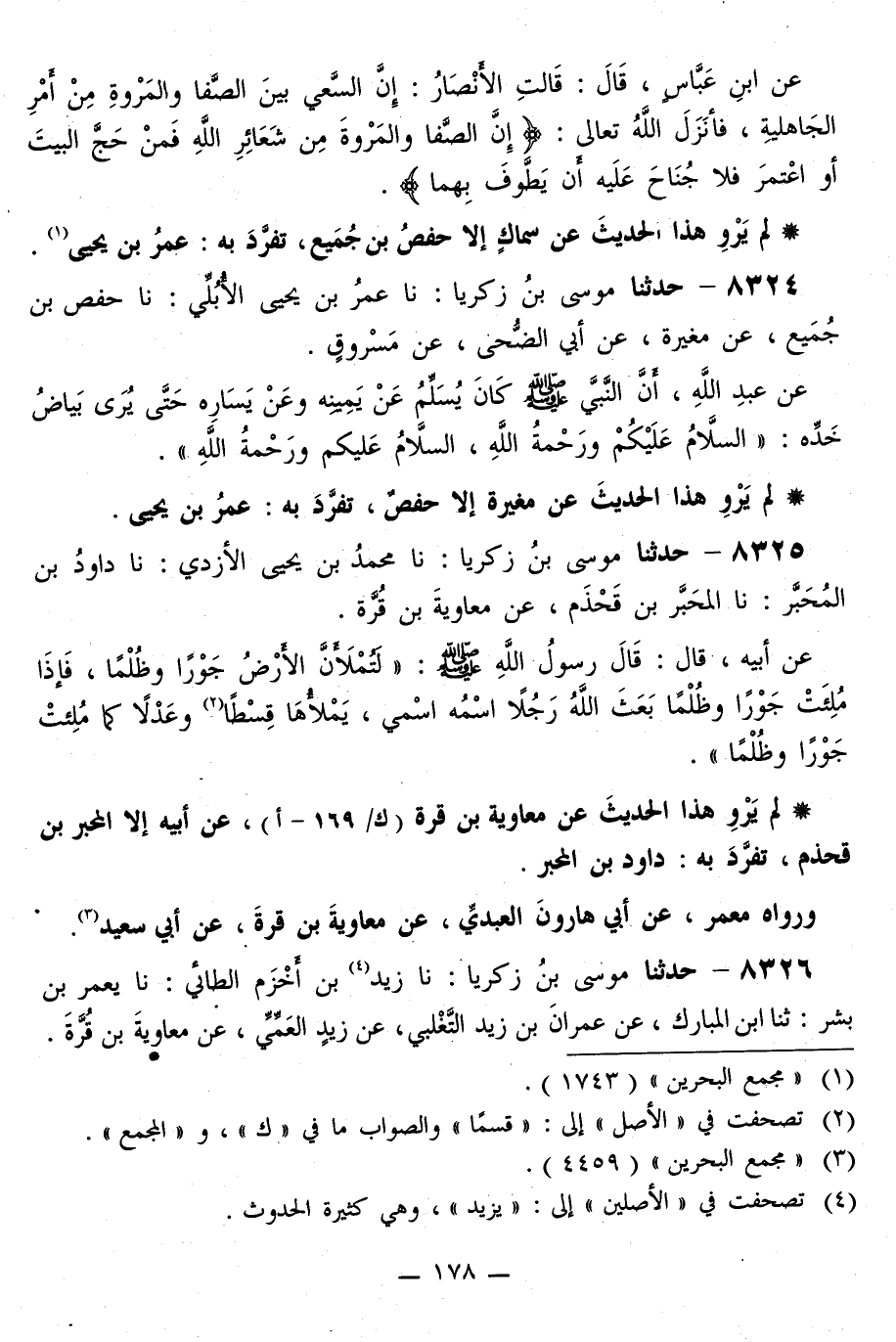 8324 - حَدَّثَنَا مُوسَى بْنُ زَكَرِيَّا، نا عُمَرُ بْنُ يَحْيَى الْأُبُلِّيُّ، نا حَفْصُ بْنُ جُمَيْعٍ، عَنْ مُغِيرَةَ، عَنْ أَبِي الضُّحَى، عَنْ مَسْرُوقٍ، عَنْ عَبْدِ اللَّهِ، أَنَّ النَّبِيَّ صَلَّى اللهُ عَلَيْهِ وَسَلَّمَ كَانَ §يُسَلِّمُ عَنْ يَمِينِهِ وَعَنْ يَسَارِهِ حَتَّى يُرَى بَيَاضُ خَدِّهِ: «السَّلَامُ عَلَيْكُمْ وَرَحْمَةُ اللَّهِ السَّلَامُ عَلَيْكُمْ وَرَحْمَةُ اللَّهِ»