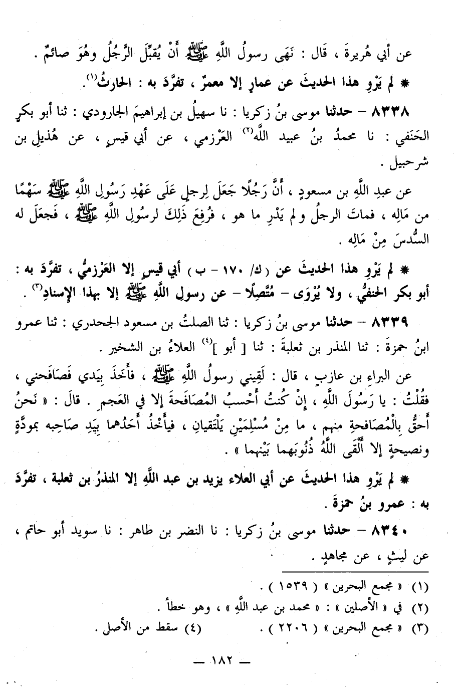 8339 - حَدَّثَنَا مُوسَى بْنُ زَكَرِيَّا، ثَنَا الصَّلْتُ بْنُ مَسْعُودٍ الْجَحْدَرِيُّ، ثَنَا عَمْرُو بْنُ حَمْزَةَ، ثَنَا الْمُنْذِرُ بْنُ ثَعْلَبَةَ، ثَنَا أَبُو الْعَلَاءِ بْنُ الشِّخِّيرِ، عَنِ الْبَرَاءِ بْنِ عَازِبٍ قَالَ: لَقِيَنِي رَسُولُ اللَّهِ صَلَّى اللهُ عَلَيْهِ وَسَلَّمَ فَأَخَذَ بِيَدِي، فَصَافَحَنِي، فَقُلْتُ: يَا رَسُولَ اللَّهِ، إِنْ كُنْتُ أَحْسَبُ الْمُصَافَحَةَ إِلَّا فِي الْعَجَمِ. قَالَ: «نَحْنُ أَحَقُّ بِالْمُصَافَحَةِ مِنْهُمْ، §مَا مِنْ مُسْلِمَيْنِ يَلْتَقِيَانِ فَيَأْخُذُ أَحَدُهُمَا بَيَدِ صَاحِبِهِ بِمَوَدَّةٍ وَنَصِيحَةٍ إِلَّا أَلْقَى اللَّهُ ذُنُوبَهُمَا بَيْنَهُمَا»
