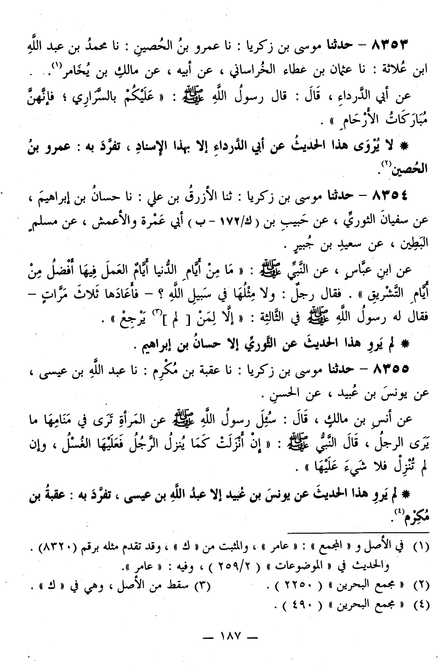 8353 - حَدَّثَنَا مُوسَى بْنُ زَكَرِيَّا، نا عَمْرُو بْنُ الْحُصَيْنِ، نا مُحَمَّدُ بْنُ عَبْدِ اللَّهِ بْنِ عُلَاثَةَ، نا عُثْمَانُ بْنُ عَطَاءٍ الْخُرَاسَانِيُّ، عَنْ أَبِيهِ، عَنْ مَالِكِ بْنِ يُخَامِرَ، عَنْ أَبِي الدَّرْدَاءِ،: قَالَ: قَالَ رَسُولُ اللَّهِ صَلَّى اللهُ عَلَيْهِ وَسَلَّمَ: «§عَلَيْكُمْ بِالسَّرِارِي، فَإِنَّهُنَّ مُبَارَكَاتُ الْأَرْحَامِ» ، لَا يُرْوَي هَذَا الْحَدِيثُ عَنْ أَبِي الدَّرْدَاءِ إِلَّا بِهَذَا الْإِسْنَادِ، تَفَرَّدَ بِهِ عَمْرُو بْنُ الْحُصَيْنِ