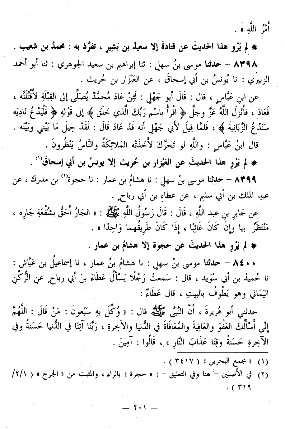 8398 - حَدَّثَنَا مُوسَى بْنُ سَهْلٍ، ثَنَا إِبْرَاهِيمُ بْنُ سَعِيدٍ الْجَوْهَرِيُّ، ثَنَا أَبُو أَحْمَدَ الزُّبَيْرِيُّ، نا يُونُسُ بْنُ أَبِي إِسْحَاقَ، عَنِ الْعَيْزَارِ بْنِ حُرَيْثٍ، عَنِ ابْنِ عَبَّاسٍ قَالَ: قَالَ أَبُو جَهْلٍ: «§لَئِنْ عَادَ مُحَمَّدٌ يُصَلِّي إِلَى الْقِبْلَةِ لَأَقْتُلَنَّهُ، فَعَادَ، فَأَنْزَلَ اللَّهُ عَزَّ وَجَلَّ {اقْرَأْ بِاسْمِ رَبِّكَ الَّذِي خَلَقَ} [العلق: 1] إِلَى قَوْلِهِ {فَلْيَدْعُ نَادِيَهُ سَنَدْعُ الزَّبَانِيَةَ} [العلق: 18] ، فَلَمَّا قِيلَ لِأَبِي جَهْلٍ إِنَّهُ قَدْ عَادَ قَالَ: لَقَدْ حِيلَ مَا بَيْنِي وَبَيْنَهُ» ، قَالَ ابْنُ عَبَّاسٍ: وَاللَّهِ لَوْ تَحَرَّكَ لَأَخَذَتْهُ الْمَلَائِكَةُ وَالنَّاسُ يَنْظُرُونَ، لَمْ يَرْوِ هَذَا الْحَدِيثَ عَنِ الْعَيْزَارِ بْنِ حُرَيْثٍ إِلَّا يُونُسُ بْنُ أَبِي إِسْحَاقَ