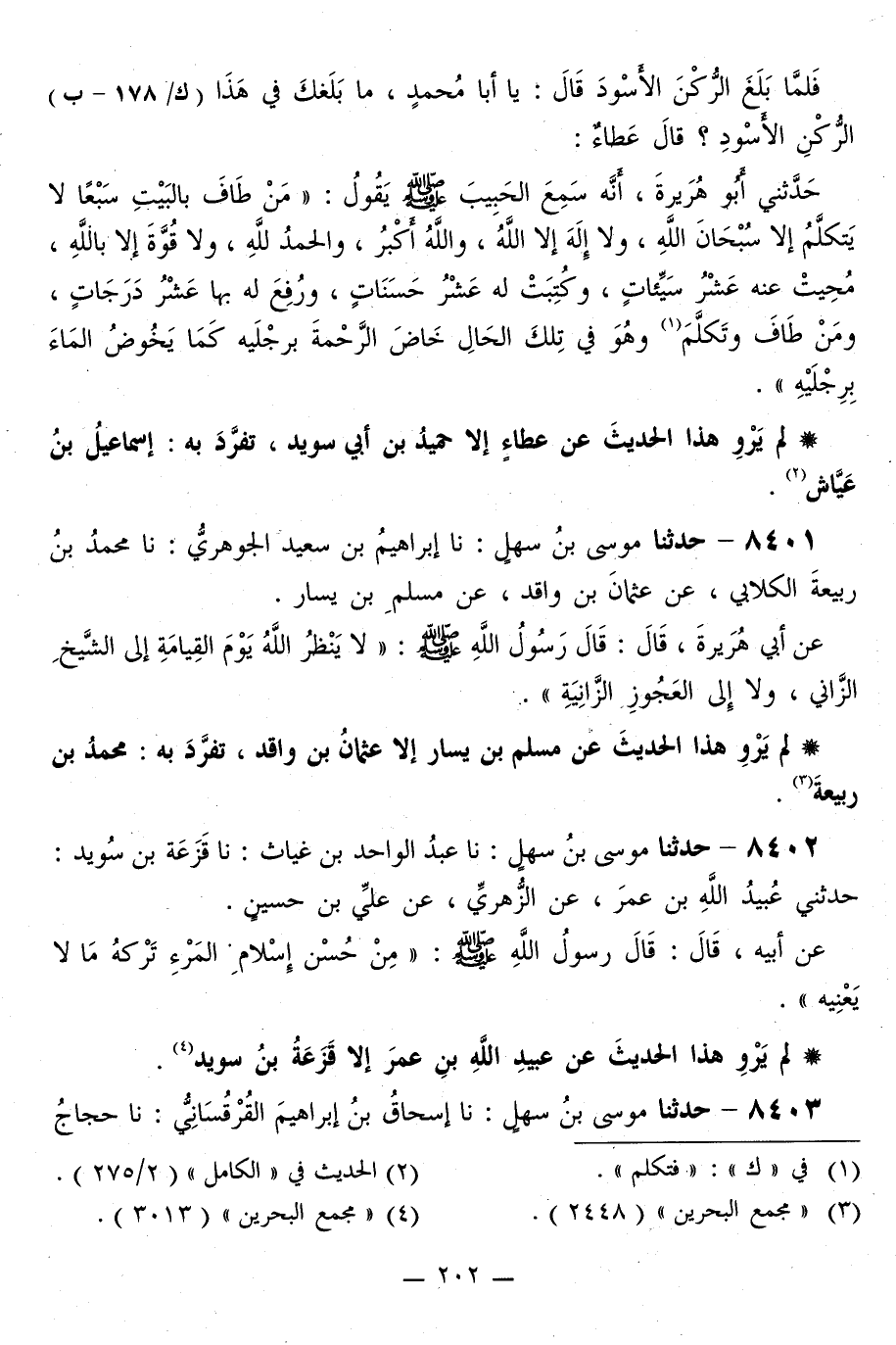 فَلَمَّا بَلَغَ الرُّكْنَ الْأَسْوَدَ قَالَ: يَا أَبَا مُحَمَّدٍ، مَا بَلَغَكَ فِي هَذَا الرُّكْنِ الْأَسْوَدِ؟ قَالَ عَطَاءٌ: حَدَّثَنِي أَبُو هُرَيْرَةَ أَنَّهُ سَمِعَ الْحَبِيبَ صَلَّى اللهُ عَلَيْهِ وَسَلَّمَ يَقُولُ: «§مَنْ طَافَ بِالْبَيْتِ سَبْعًا لَا يَتَكَلَّمُ إِلَّا سُبْحَانَ اللَّهِ، وَلَا إِلَهَ إِلَّا اللَّهُ، وَاللَّهُ أَكْبَرُ، وَالْحَمْدُ لِلَّهِ، وَلَا قُوَّةَ إِلَّا بِاللَّهِ، مُحِيَتْ عَنْهُ عَشْرُ سَيِّئَاتٍ، وَكُتِبَتْ لَهُ عَشْرُ حَسَنَاتٍ، وَرُفِعَ لَهُ بِهَا عَشْرُ دَرَجَاتٍ، وَمَنْ طَافَ وَتَكَلَّمَ وَهُوَ فِي تِلْكَ الْحَالِ خَاضَ الرَّحْمَةَ بِرِجْلَيْهِ كَمَا يَخُوضُ الْمَاءَ بِرِجْلَيْهِ»